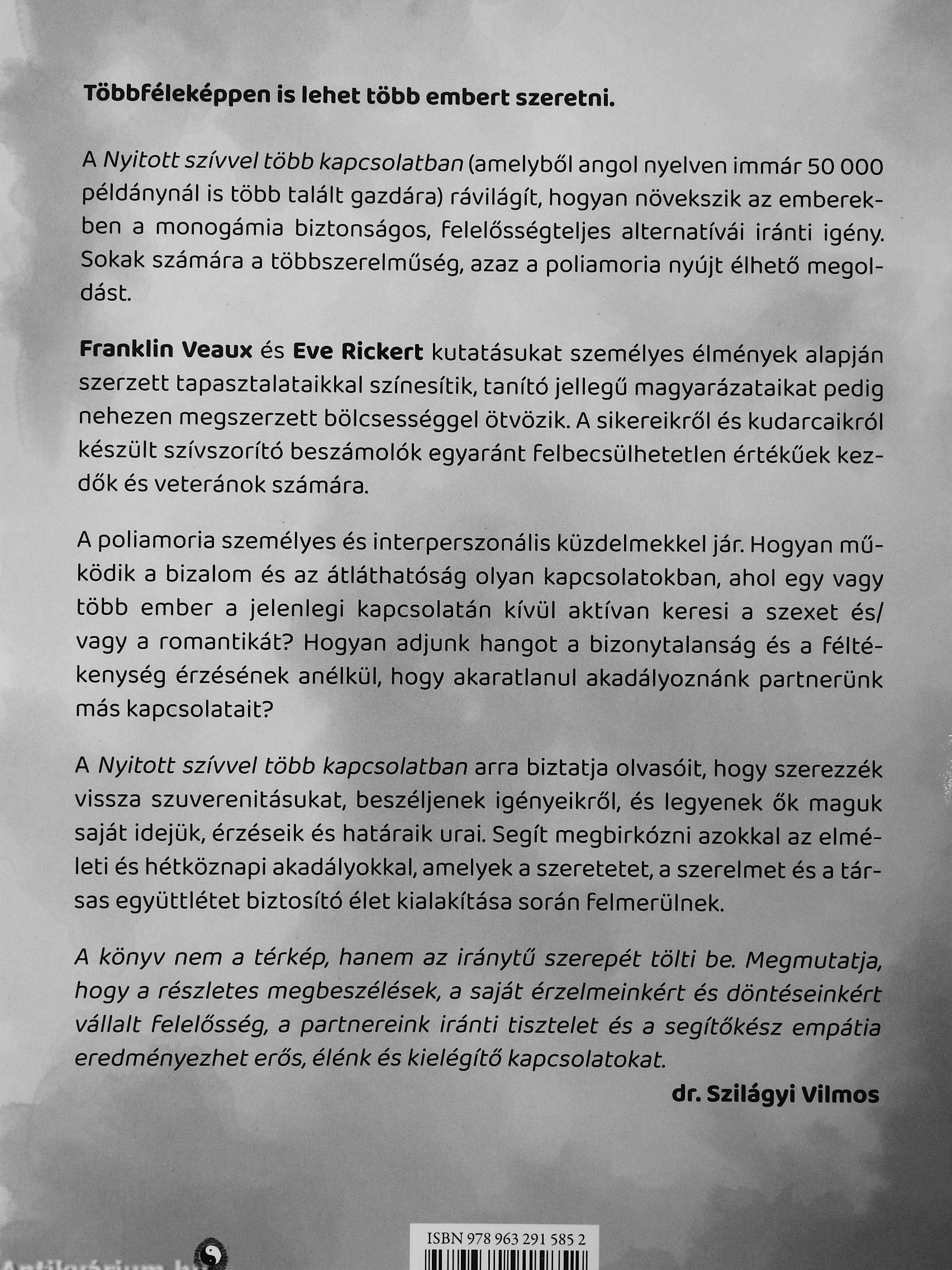A Nyitott szívvel több kapcsolatban (ame\ybö\ angol nyelven immár 50 000 példánynál is több talált gazdára) rávilágít, hogyan növekszik az emberekben a monogámia biztonságos, Felelősségteljes alternatívái iránti igény. Sokak számára a többszerelmüség, azaz a poliamoria nyújt élhető megoldást.