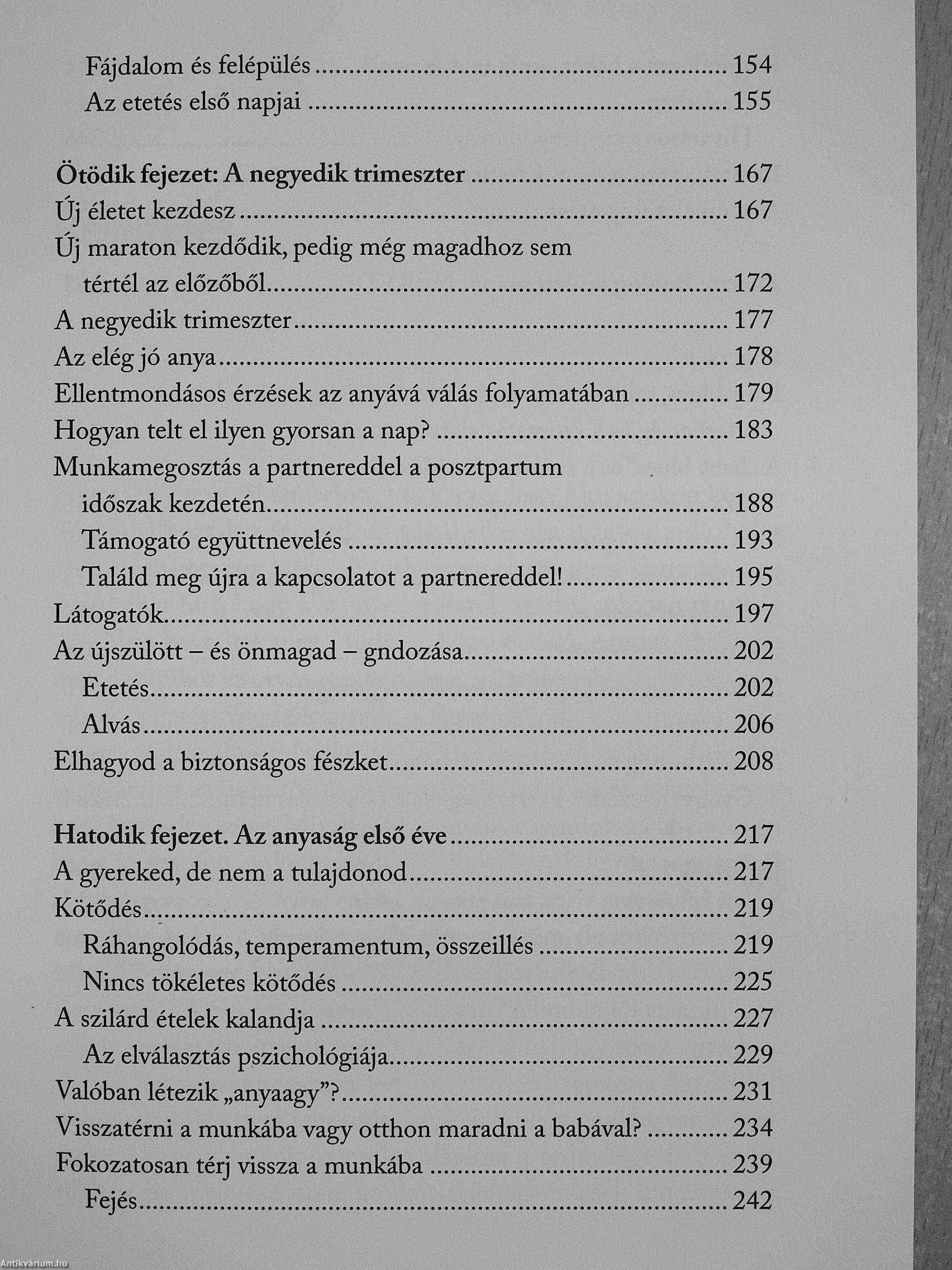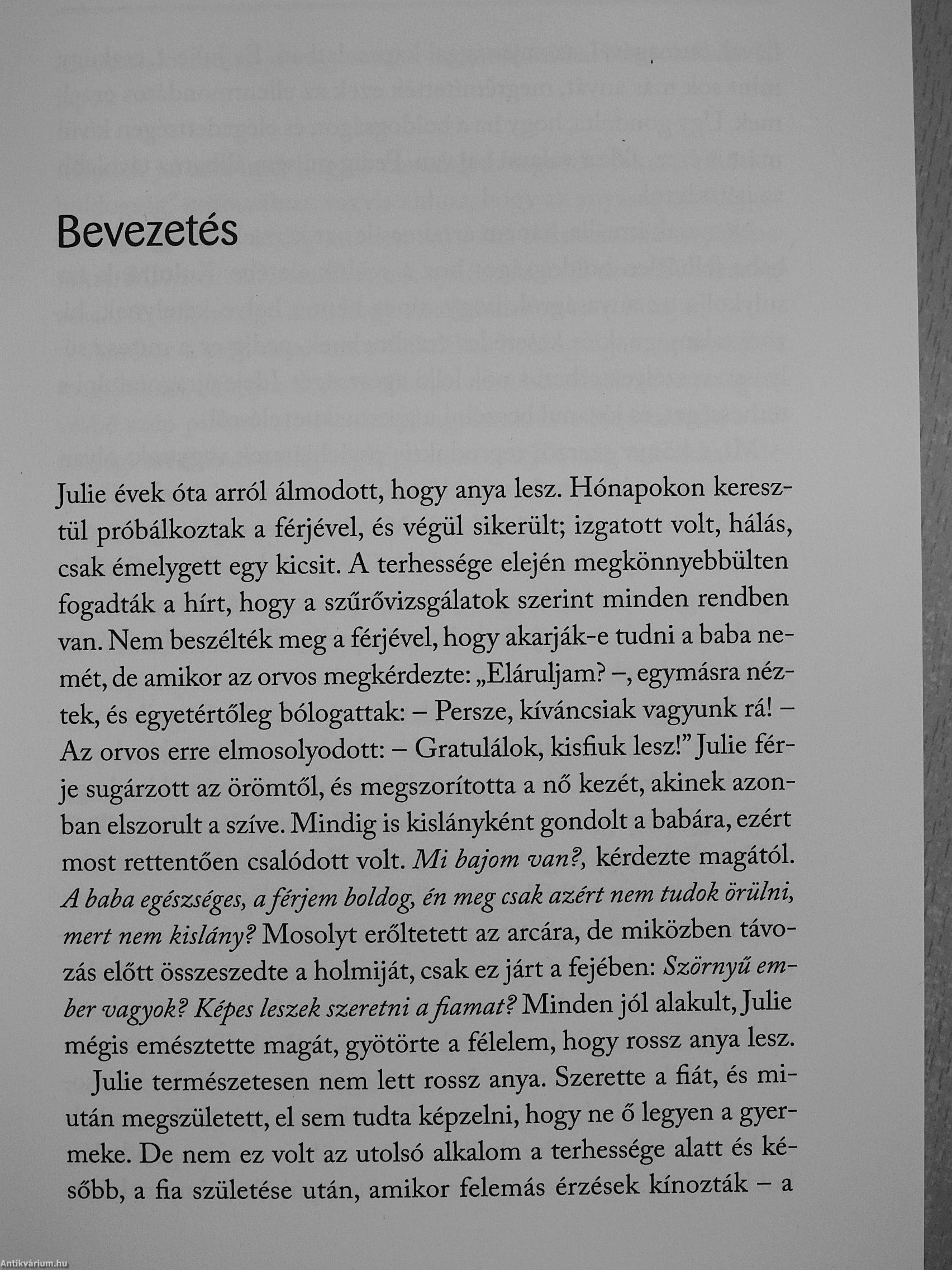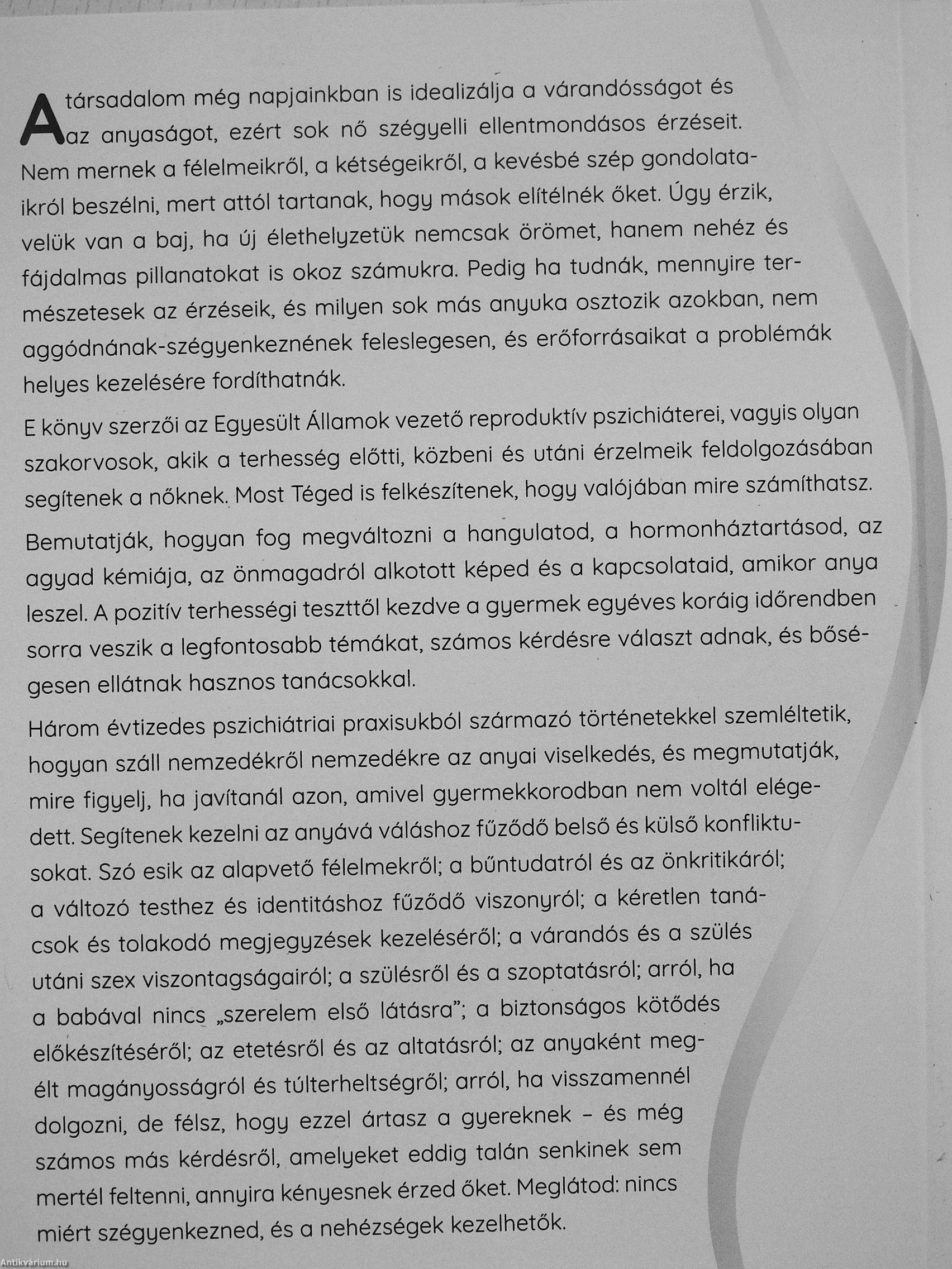 Három évtizedes pszichiátriai praxisukból származó történetekkel szemléltetik, hogyan száll nemzedékről nemzedékre az anyai viselkedés, és megmutatják, mire figyelj, ha javítanál azon. amivel gyermekkorodban nem voltál elégedett Segítenek kezelni az anyává váláshoz fűződő belső és külső konfliktusokat. Szó esik az alapvető félelmekről; a bűntudatról és az önkritikáról; a változó testhez és identitáshoz fűződő viszonyról; a kéretlen tanácsok és tolakodó megjegyzések kezeléséről; a várandós és a szülés utáni szex viszontagságairól; a szülésről és a szoptatásról; arról, ha a babával nincs „szerelem első lótósra"; a biztonságos kötődés előkészítéséről; az etetésről és az altatásról; az anyaként megélt magányosságról és túlterheltségről; arról, ha visszamennél dolgozni, de félsz, hogy ezzel ártasz a gyereknek - és még számos más kérdésről, amelyeket eddig talán senkinek sem mertél feltenni, annyira kényesnek érzed őket. Meglátod: nincs miért szégyenkezned, és a nehézségek kezelhetők.