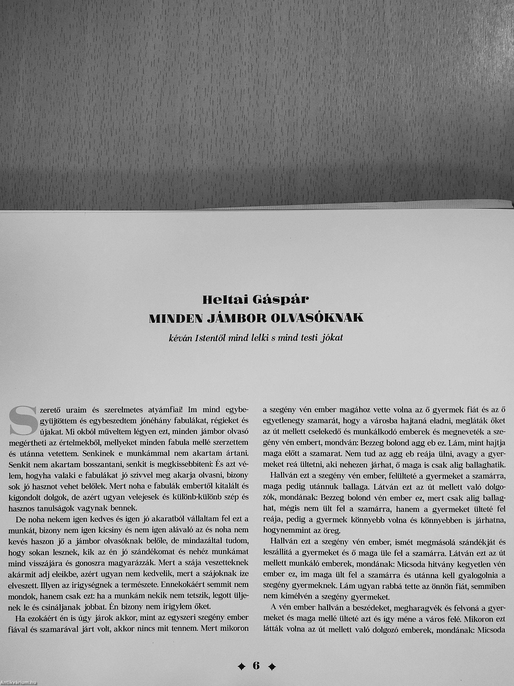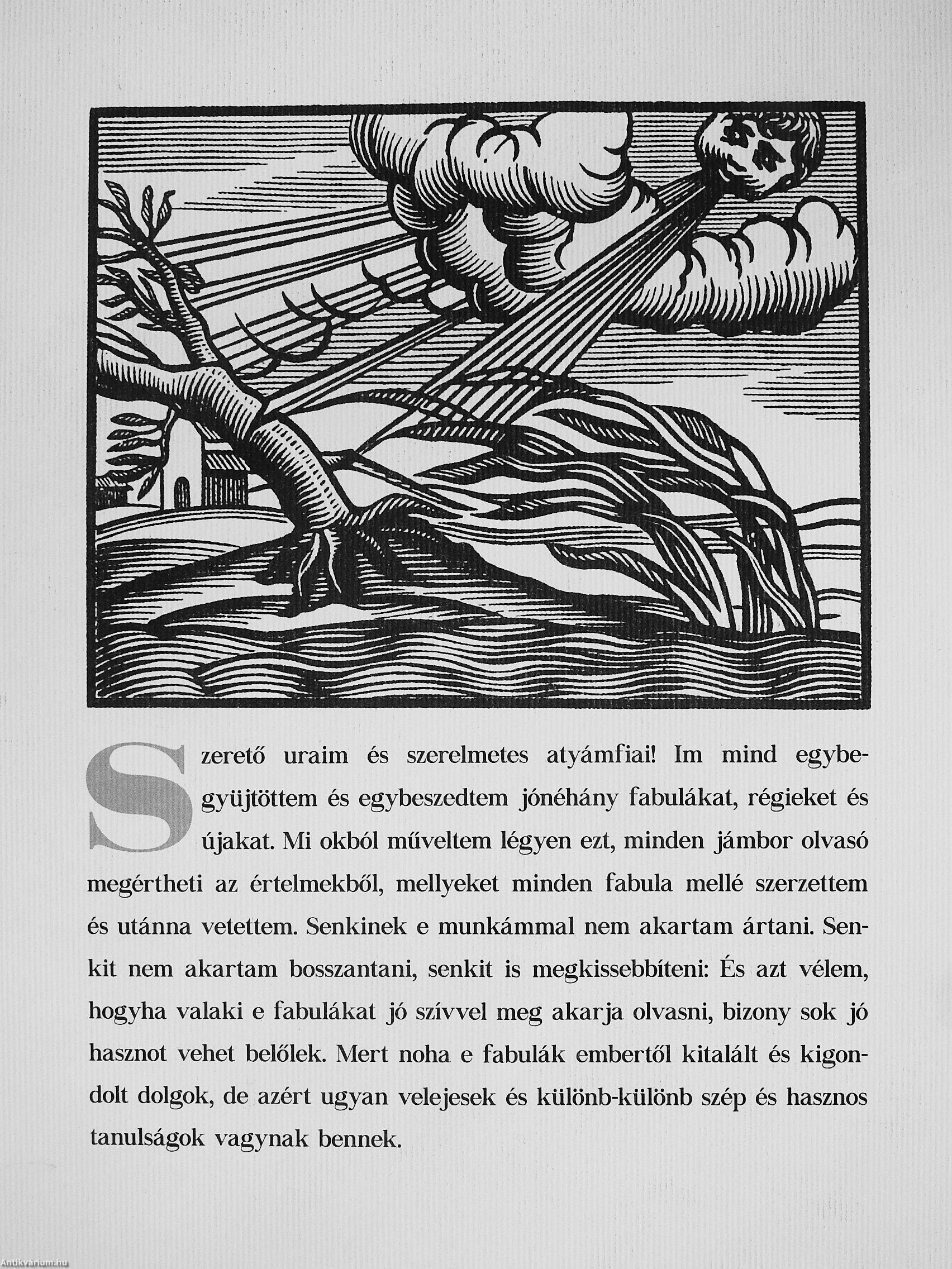 Szerető uraim és szerelmetes atyámfiai! lm mind egybe-gyiijtöttem és egybeszedtem jónéhány fabulákat, régieket és újakat. Mi okból műveltem légyen ezt, minden jámbor olvasó megértheti az értelmekből, mellyeket minden fabula mellé szerzettem és utánna vetettem. Senkinek e munkámmal nem akartam ártani. Senkit nem akartam bosszantani, senkit is megkissebbiteni: És azt vélem, hogyha valaki e fabulákat jó szivvel meg akarja olvasni, bizony sok jó hasznot vehet belőlek. Mert noha e fabulák embertől kitalált és kigondolt dolgok, de azért ugyan velejesek és különb-különb szép és hasznos tanulságok vágynák bennek.