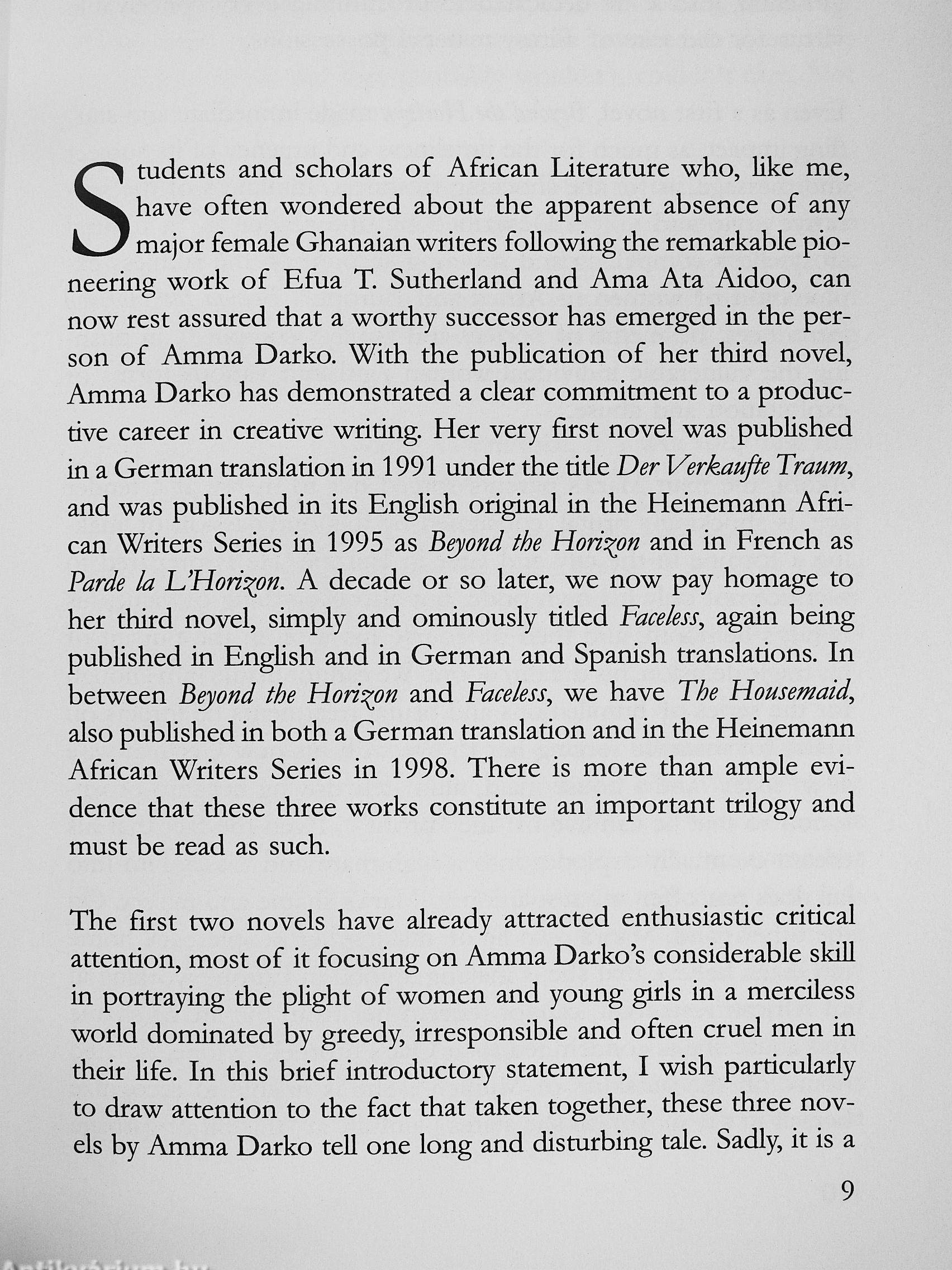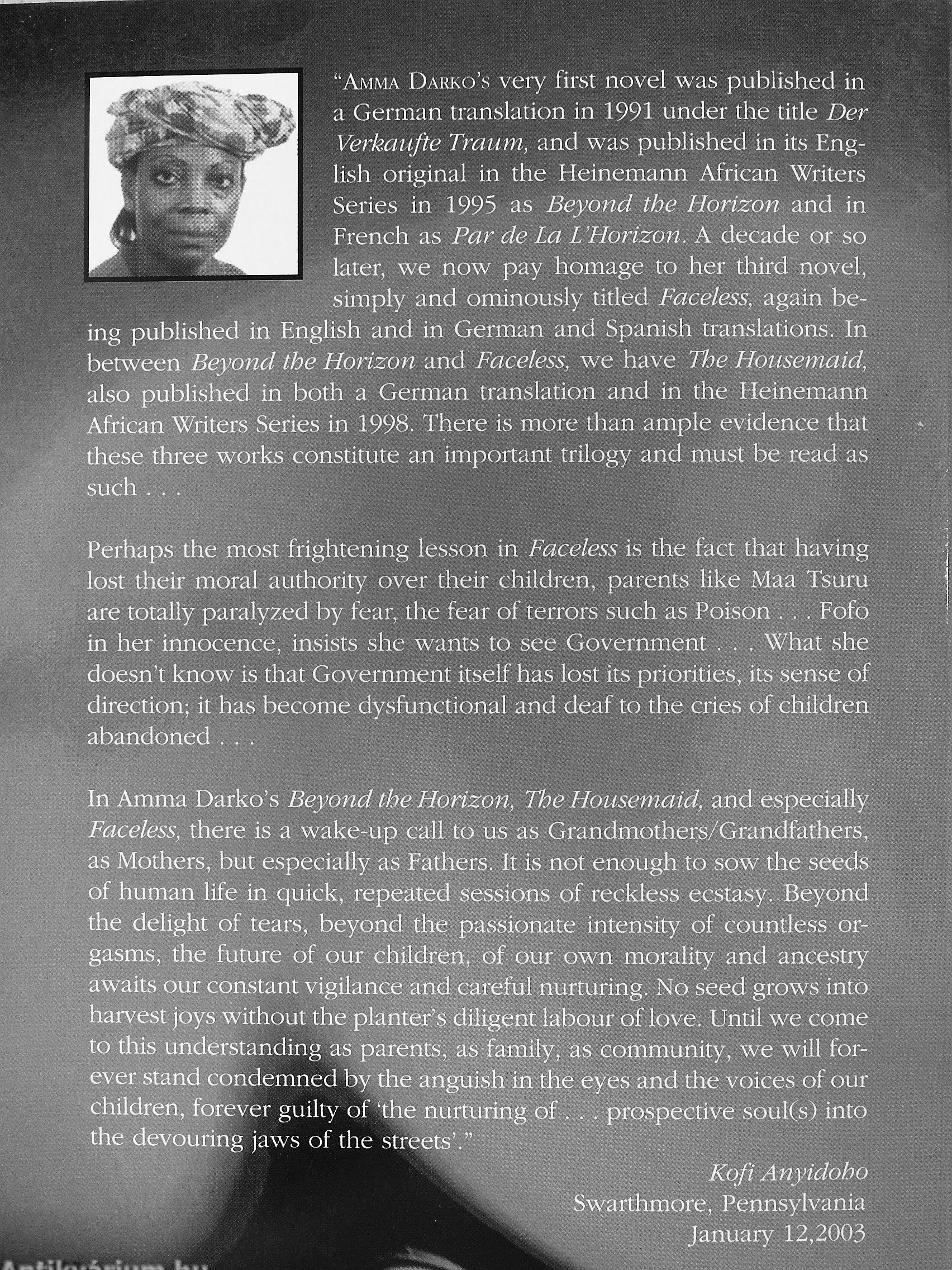 simply and ominously titled Faceless, again being published in English and in German and Spanish translations. In between Beyond the Horizon and Faceless, we have The Housemaid, also published in both a German translation and in the Heinemann African Writers Series in 1998. There is more than ample evidence that these three works constitute an important trilogy and must be read as such . . .