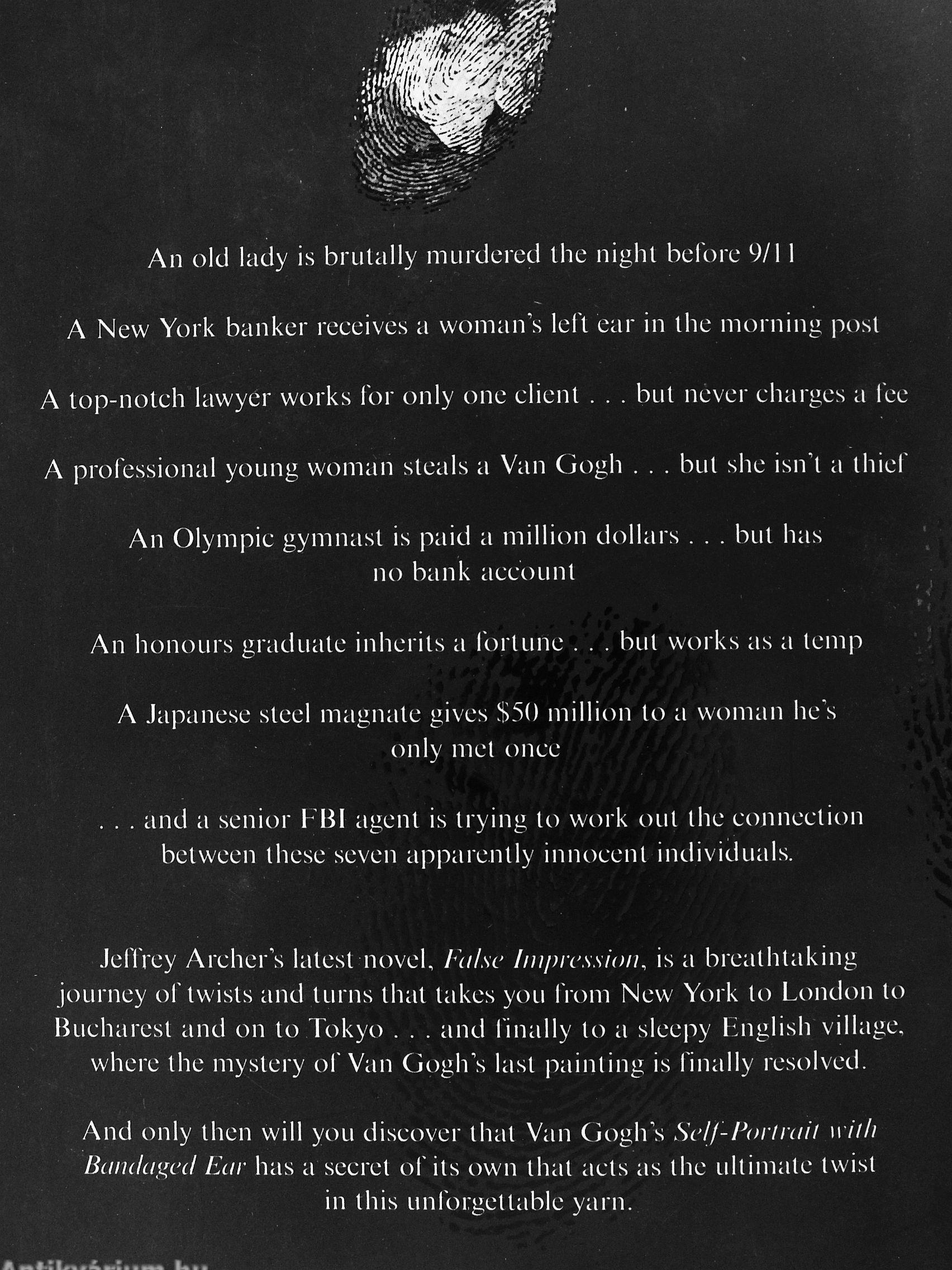Jeffrey Arehers latest novel. False Impression, is a breathtaking journey of twists and turns that takes you frt)m New York to London lo Bucharest and on lo Tokyo . . . and finally lo a sleepy linglish village, where the mystery of Van Gogh s last painting is finally resolved.