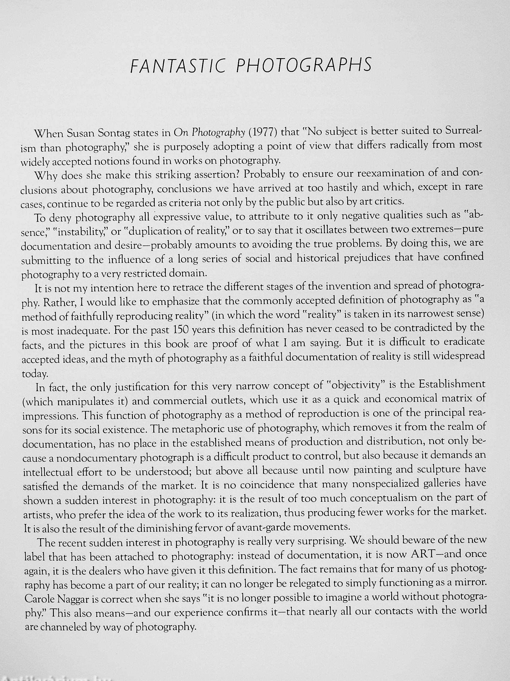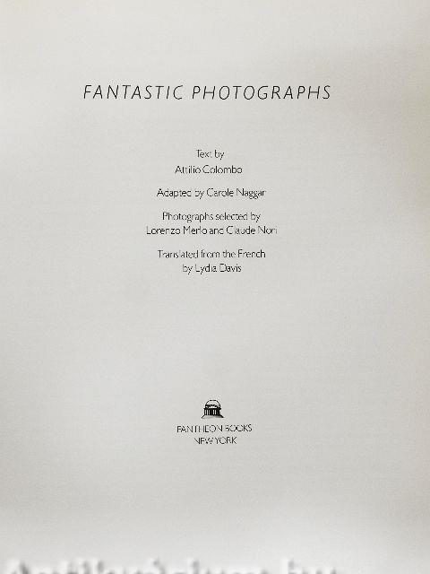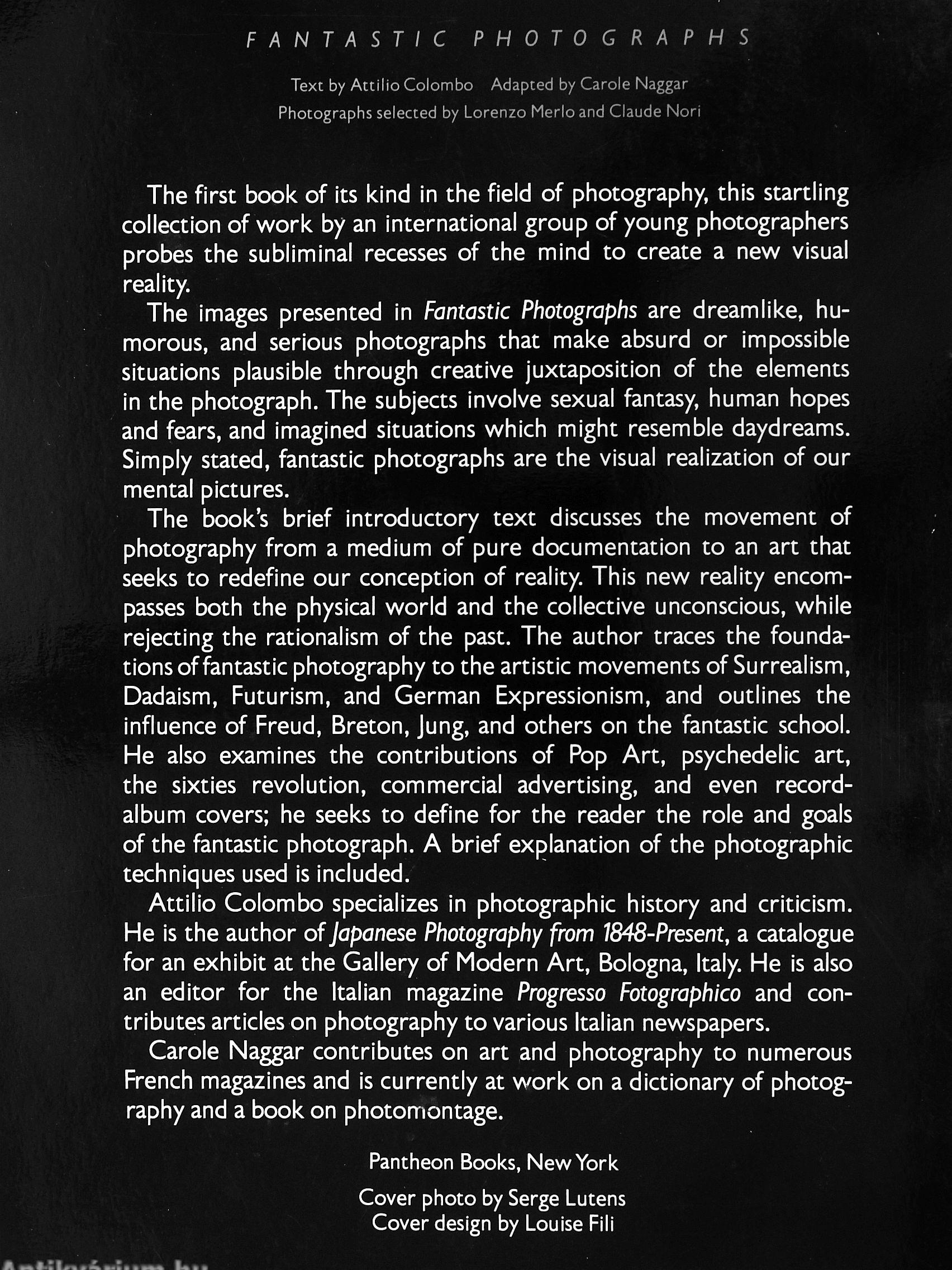 The book's brief introductory text discusses the movement of photography from a medium of pure documentation to an art that seeks to redefine our conception of reality. This new reality encompasses both the physical world and the collective unconscious, while rejecting the rationalism of the past. The author traces the foundations of fantastic photography to the artistic movements of Surrealism, Dadaism, Futurism, and German Expressionism, and outlines the influence of Freud, Breton, Jung, and others on the fantastic school. He also examines the contributions of Pop Art, psychedelic art, the sixties revolution, commercial advertising, and even record-album covers; he seeks to define for the reader the role and goals of the fantastic photograph. A brief explanation of the photographic techniques used is included.