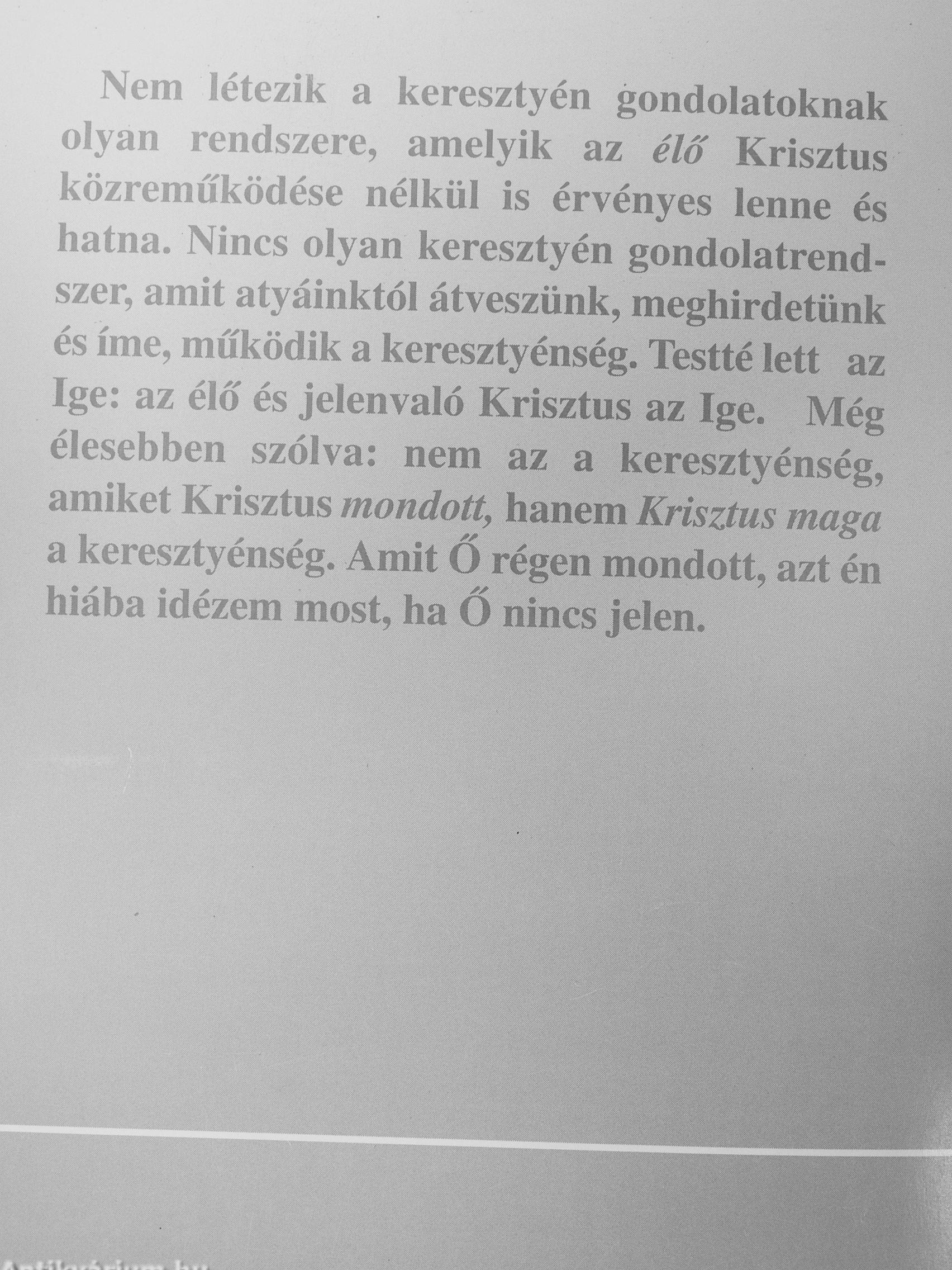 Nem létezik a keresztyén gondolatoknak olyan rendszere, amelyik az élő Krisztus közreműködése nélkül ís érvényes lenne és hatna. Nincs olyan keresztyén gondolatrendszer, amit atyáinktól átveszünk, meghirdetünk és íme, működik a keresztyénség. Testté lett az Ige: az élő és jelenvaló Krisztus az Ige. Még élesebben szólva: nem az a keresztyénség, amiket Krisztus mondott, hanem Krisztus maga a keresztyénség. Amit Ő régen mondott, azt én hiába idézem most, ha Ő nincs jelen.