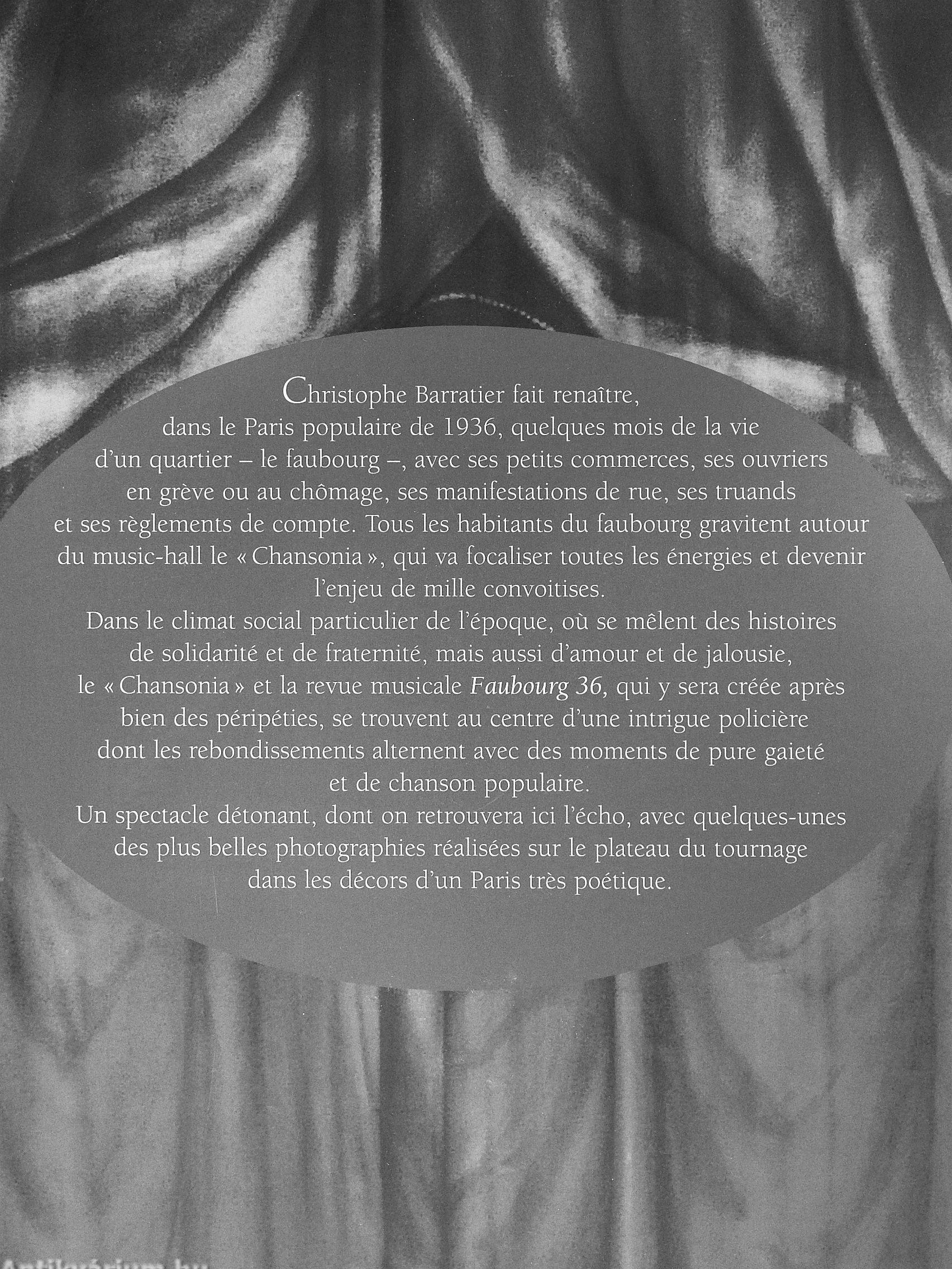 de solidarité et de fraternité, mais aussi d'amour et de jalousie, le « Chansonia » et la revue musicale Faubourg 36, qui y sera créée apres bien des péripéties, se trouvent au centre d'une intrigue policiere dont les rebondissements alternent avec des moments de pure gaieté et de chanson populaire. Un spectacle détonant, dont on retrouvera ici l'écho, avec quelques-unes des plus belles photographies réalisées sur le plateau du tournage dans les décors d'un Paris tres poétique.