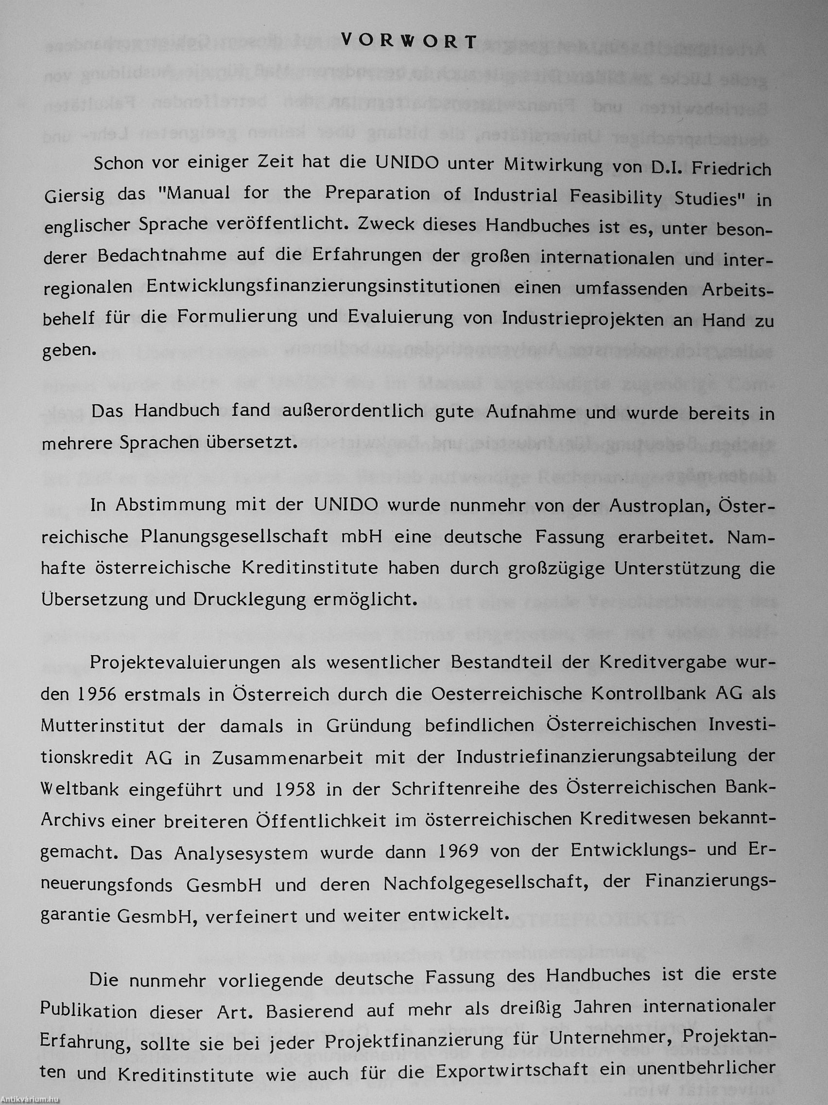 Die nunmehr' Vorliegende deutscht Fassung des IJNibO- ^Manual for the Preparation ot Industrial Feasibility Studies'" ist die erste Publikation dieser Art. Ihr Zweck ist es, unter Bedachtnahme auf die Erfahrungen der großen internationalen und interregiönalen Ept-wicklungsfinanzierungsirjistitutionen einen; umfassenden Arbeitsbehelf ^ für die Formulierung und Evaluierung von Industrieprojekten an Hand zu gebend/ > .