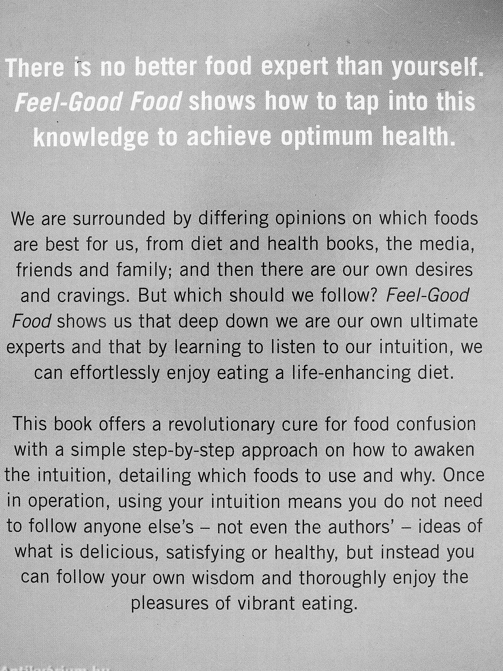 We are surrounded by differing opinions on which foods are best for us, from diet and health books, the media, friends and family; and then there are our own desires and cravings. But which should we follow? Feel-Good Food shorn us that deep down we are our own ultimate experts and that by learning to listen to our intuition, we can effortlessly enjoy eating a life-enhancing diet.