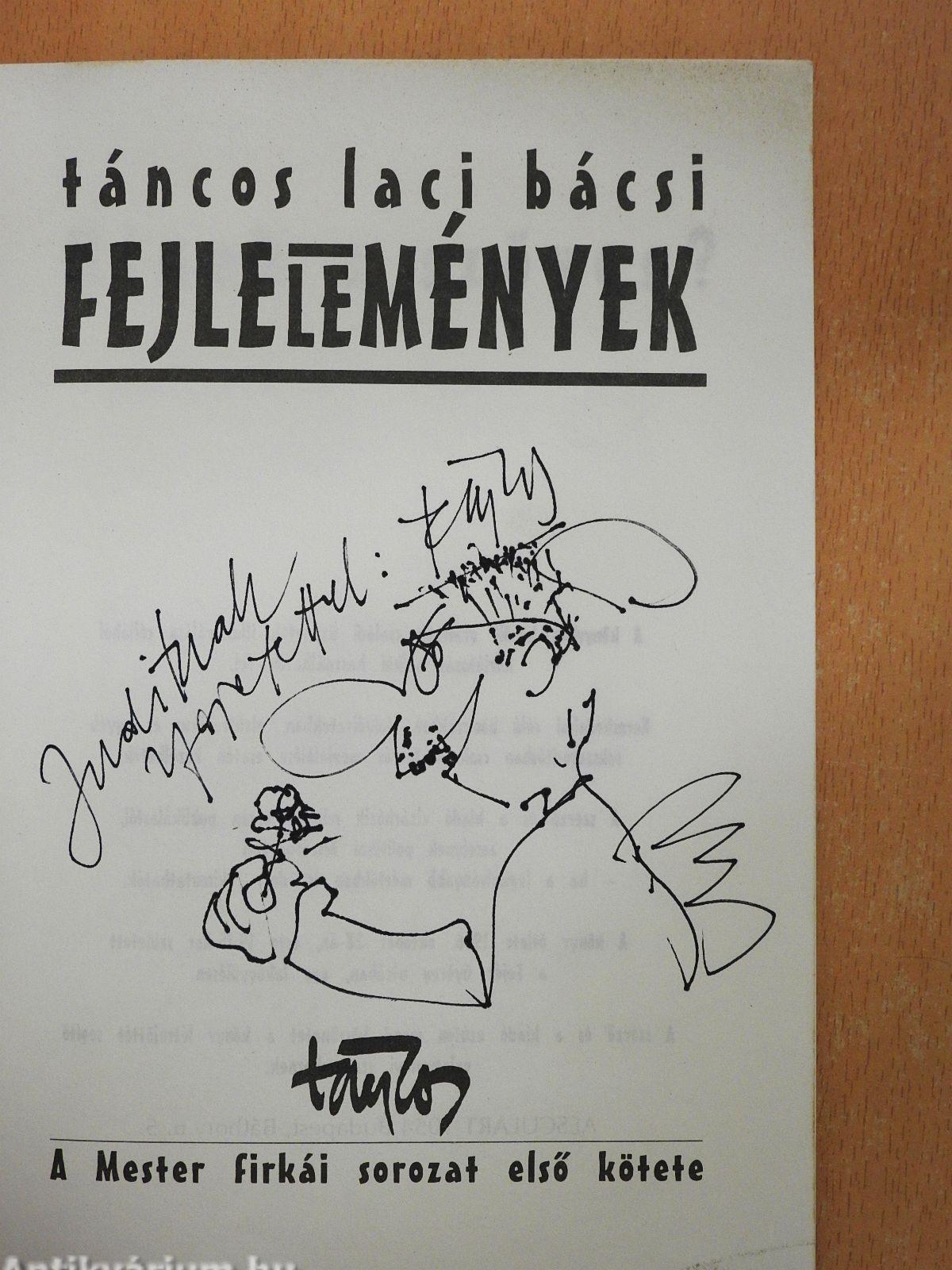 A címlapon a szerző és grafikus, Táncos Laci Bácsi névre szóló dedikációja és illusztrációja látható.