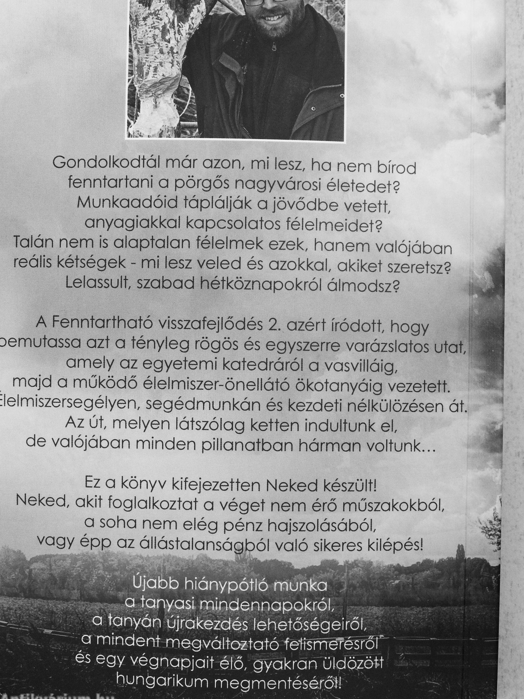 A Fenntartható visszafejlődés 2. azért íródott, hogy ^ Demutassa azt a tényleg rögös és egyszerre varázslatos utat, amely az egyetemi katedráról a vasvilláig, majd a működő élelmiszer-önellátó ökotanyóig vezetett, ilelmiszersegélyen, segédmunkán és kezdeti nélkülözésen át. Az út, melyen látszólag ketten indultunk el, de valójában minden pillanatban hárman voltunk