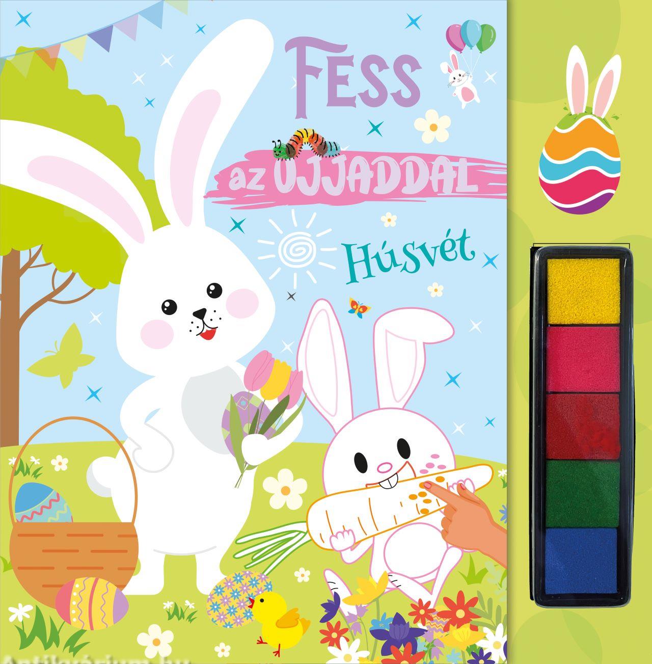 A Fess az ujjaddal - Húsvét egy igazán különleges foglalkoztatófüzet a legkisebb alkotók számára, akik imádnak maszatolni, pöttyözni és szabadon kísérletezni a színekkel. Ebben a húsvéti témájú ujjfestős kifestőben nincs szükség ecsetre vagy ceruzára - a gyermekek ujja a legfontosabb eszköz. A mellékelt festékpárnák segítségével könnyedén életre kelthetők a kedves húsvéti jelenetek: nyuszik, tojások, csibék és tavaszi motívumok várják, hogy színes alkotássá váljanak.
