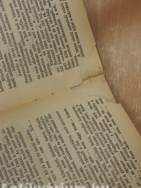 "Kinyujtotta karját, amint kilépett a könyvesboltból, mintha ezzel a mozdulattal le akarná rázni behajtott könyökének, hosszú éveken át megszokott, könyveket-szoritó tartását. Zsebében apró ezüstök biztatóan csörögtek: könnyelmü és rövid alku volt. Nagy örömében nem bánta, hogy az érték negyedét adta csak a könyvkereskedő, olyan kicsinyesnek, könnyünek, felszabaditónak tünt fel előtte az elmult évek végleges elszámolása.