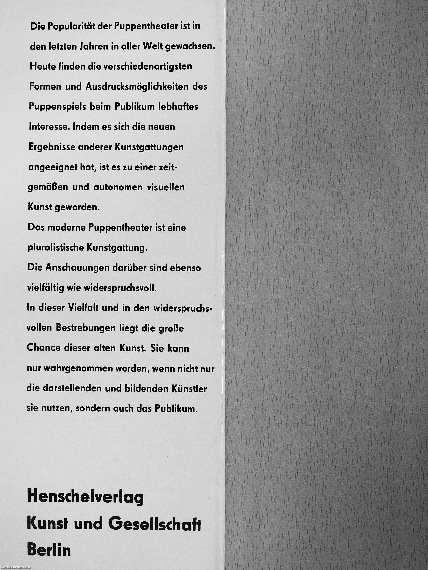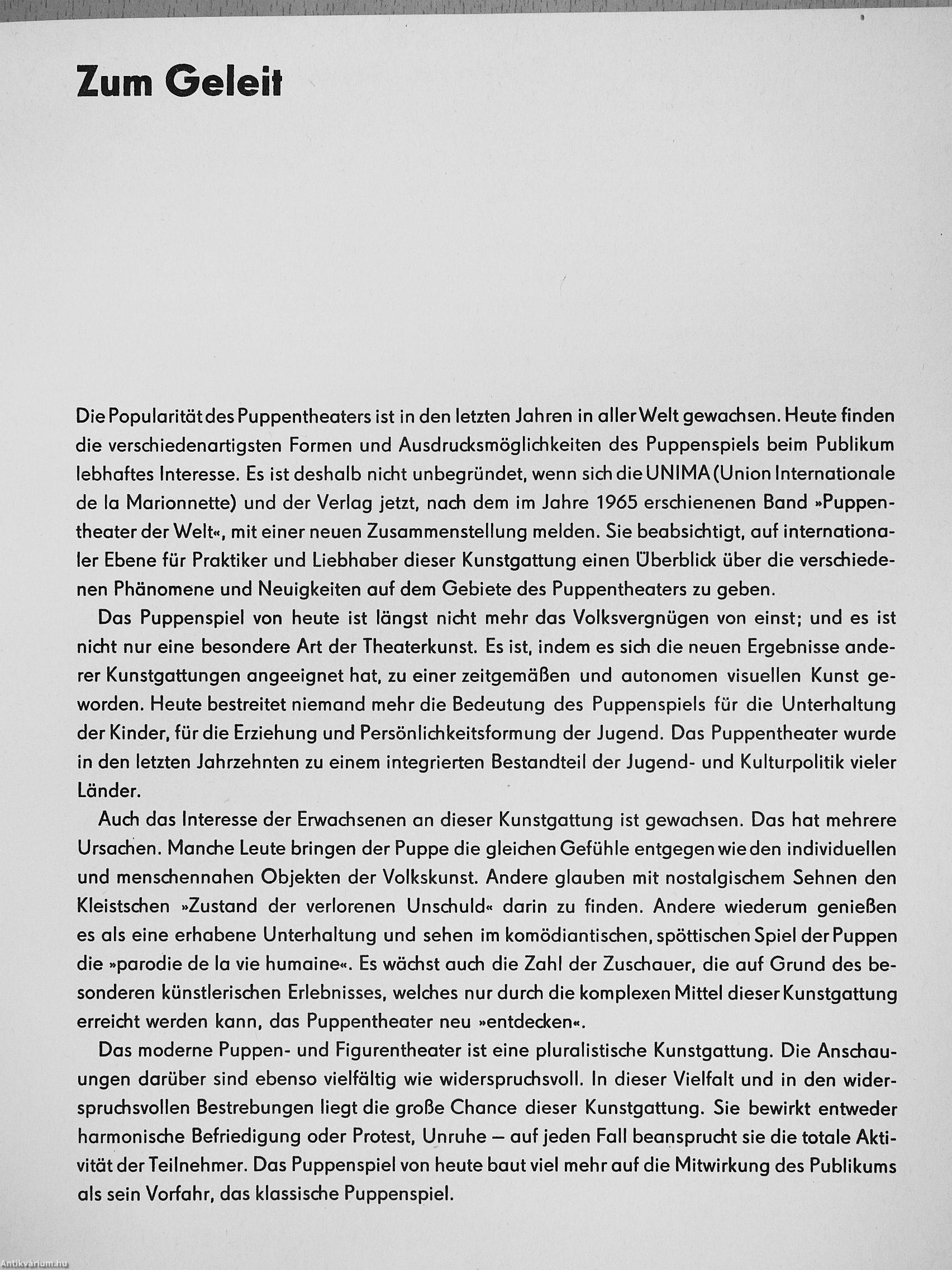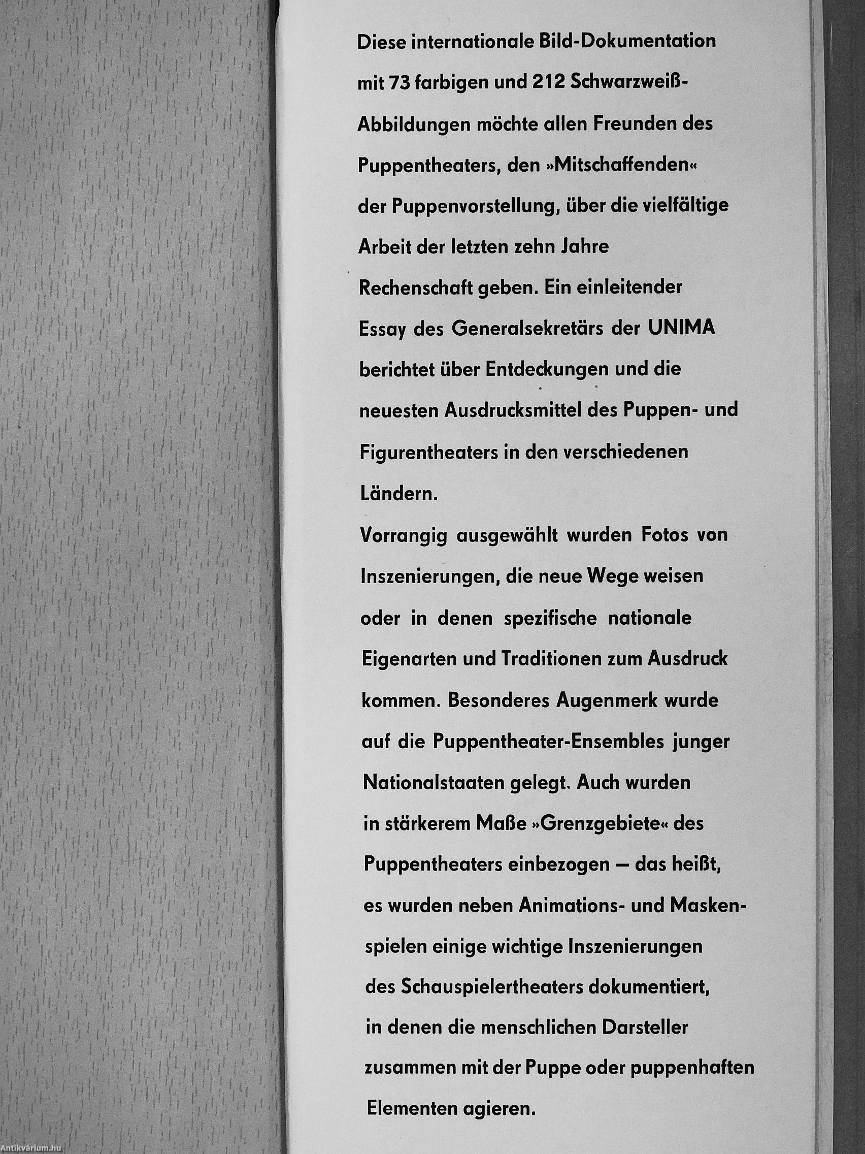 Die Popularität der Puppentheater ist in den letzten Jahren in aller Welt gewachsen. Heute finden die verschiedenartigsten Formen und Ausdrucksmöglichkeiten des Puppenspiels beim Publikum lebhaftes Interesse. Indem es sich die neuen Ergebnisse anderer Kunstgattungen angeeignet hat, ist es zu einer zeitgemäßen und autonomen visuellen Kunst geworden.