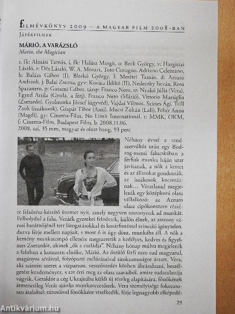 A Filmévkönyv átfogó képet nyújt a magyar film legutóbbi évéről: tartalmazza a 2008-ban készült magyar játékfilmek, kísérleti- és kisjátékfilmek, dokumentum- és animációs filmek leírását; a magyar filmek forgalmazási eredményeit, fesztiválszerepléseit, a DVD-megjelenéseket, filmheteket és egyedi vetítéseket, a Magyar Filmszemle és a hazánkban rendezett nemzetközi fesztiválok programját és díjazottait, a filmes szakirodalom újdonságait, valamint egy átfogó szakmai adattárat.