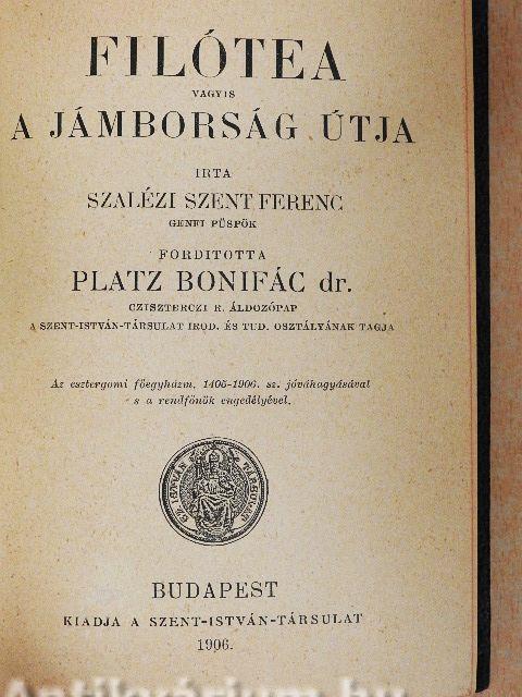 | Megjegyzés: | Írta Szalézi Szent Ferenc genfi püspök, fordította Dr. Platz Bonifác cziszterczi r. áldozópap a Szent-István-Társulat Irod. és Tud. Osztályának tagja. Nyomtatta a Stephaneum Nyomda R. T. |