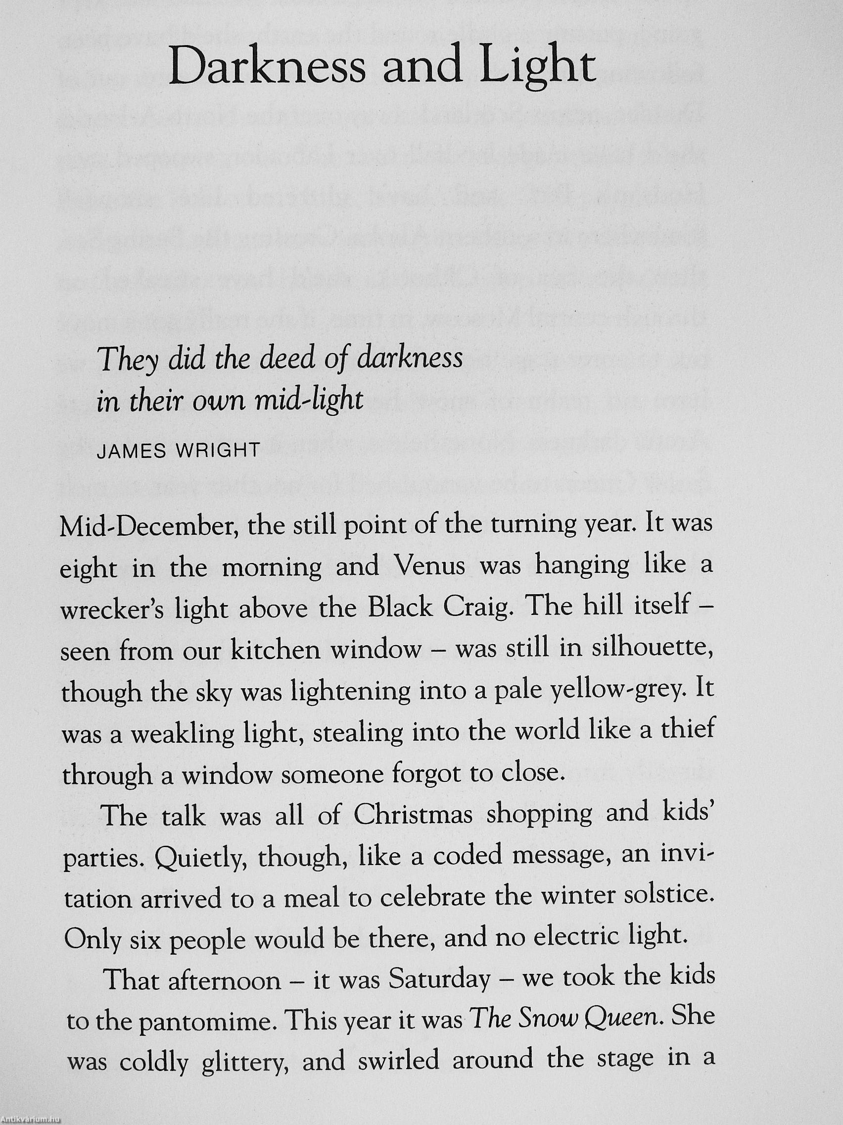 'Kathleen Jamie is a supreme hstener. Her attention - to the beckoning calls of the peregrines that nest near her house, to the brimful darkness in the neolithic chambers at Maes Howe, to the mute appeals of embryo skeletons in a medical museum -las a directness that borders on the heroic. And in the quietness of her listening, you hear her own voice: clear, subtle, respectful, and so unquenchably curious that it makes the world anew. This is as close as writing gets to a conversation with the natural world.'