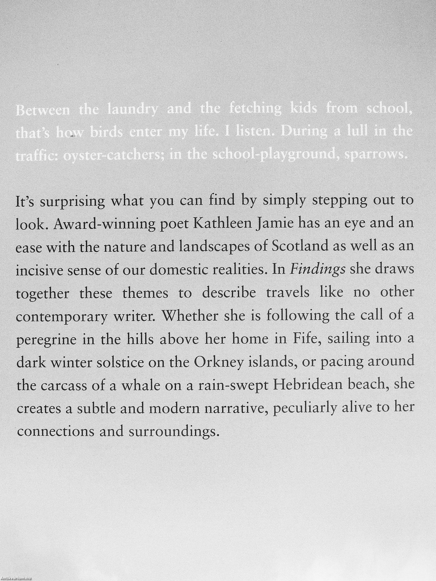 It's surprising what you can find by simply stepping out to look. Award-winning poet Kathleen Jamie has an eye and an ease with the nature and landscapes of Scotland as well as an incisive sense of our domestic realities. In Findings she draws together these themes to describe travels like no other contemporary writer. Whether she is following the call of a peregrine in the hills above her home in Fife, sailing into a dark winter solstice on the Orkney islands, or pacing around the carcass of a whale on a rain-swept Hebridean beach, she creates a subtle and modern narrative, peculiarly alive to her connections and surroundings.