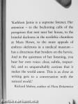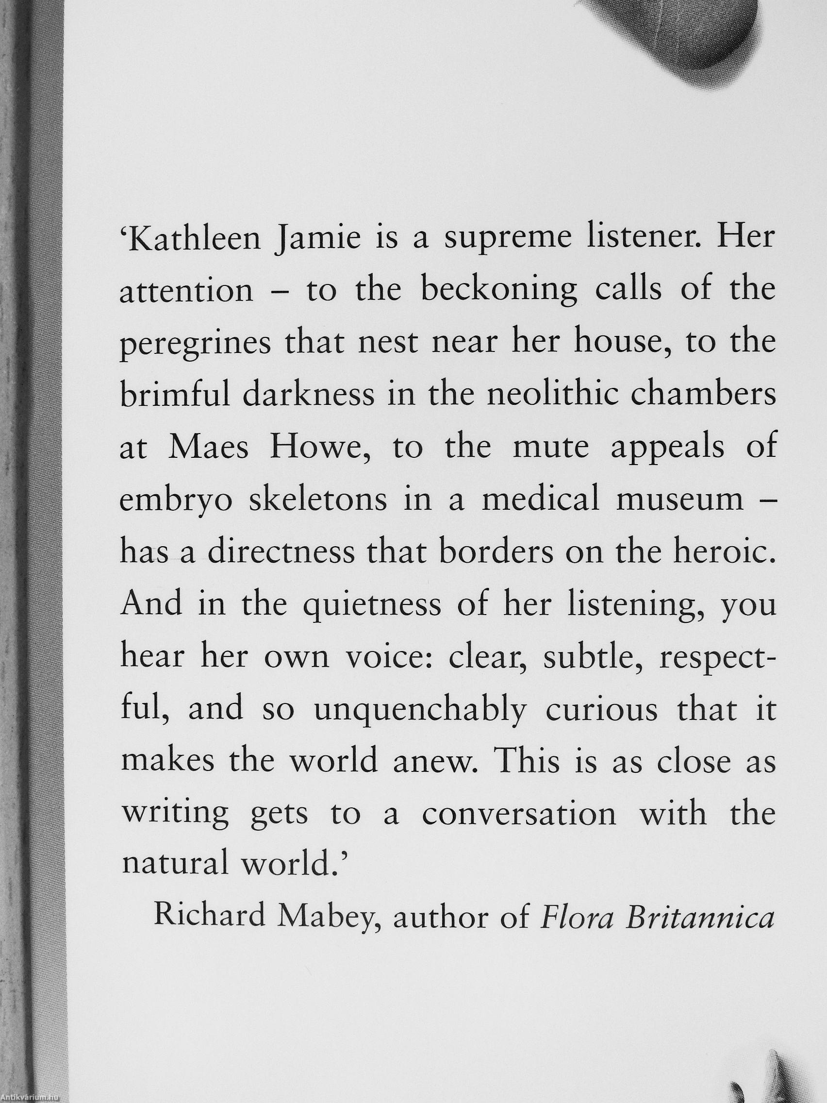 'Kathleen Jamie is a supreme hstener. Her attention - to the beckoning calls of the peregrines that nest near her house, to the brimful darkness in the neolithic chambers at Maes Howe, to the mute appeals of embryo skeletons in a medical museum -las a directness that borders on the heroic. And in the quietness of her listening, you hear her own voice:...