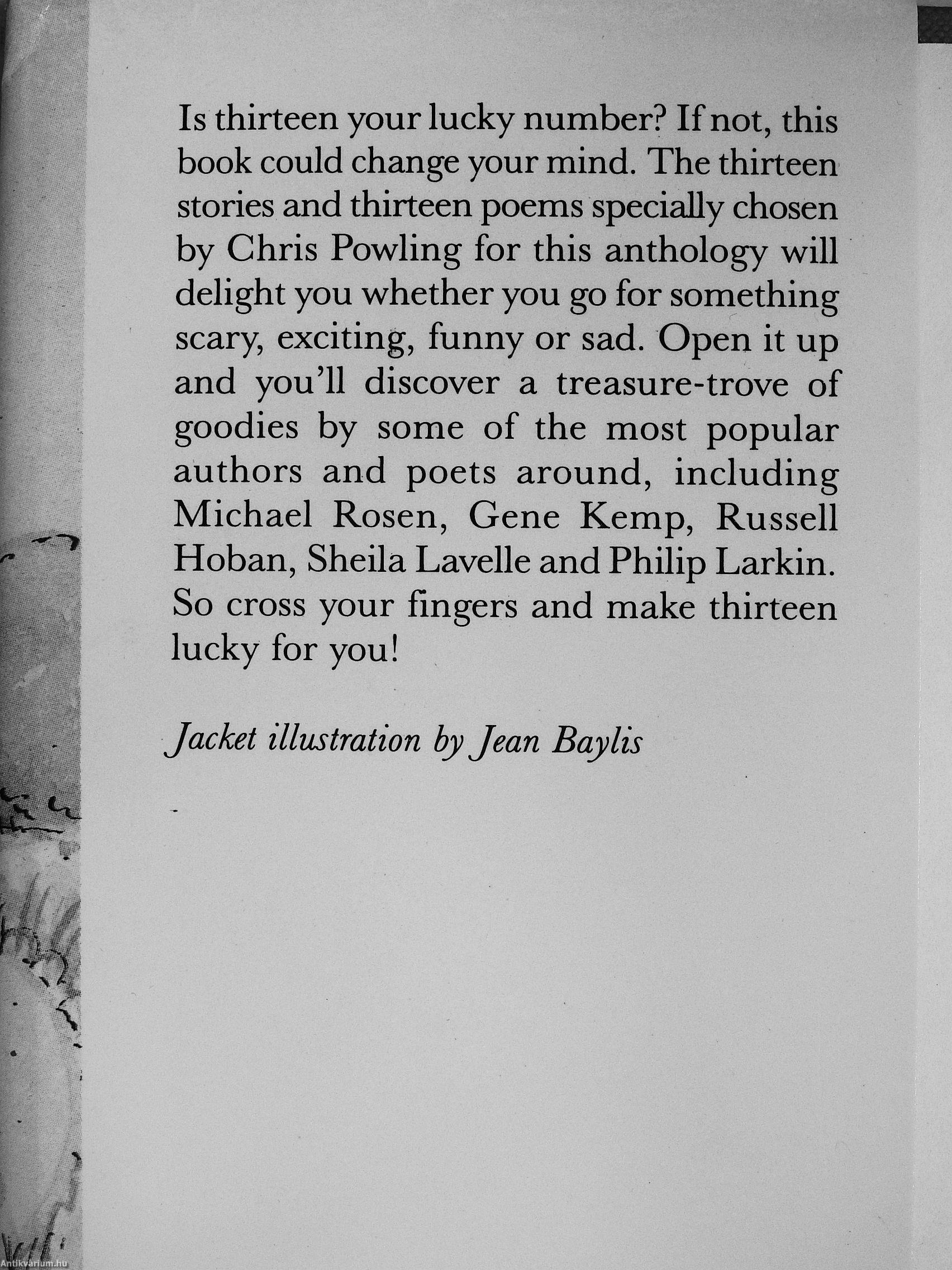 Is thirteen your lucky number? If not, this book could change your mind. The thirteen stories and thirteen poems specially chosen by Chris Fowling for this anthology will delight you whether you go for something scary, exciting, funny or sad. Open it up and you'll discover a treasure-trove of goodies by some of the most popular authors and poets around, including Michael Rosen, Gene Kemp, Russell Hoban, Sheila Lavelle and Philip Larkin. So cross your fingers and make thirteen lucky for you!