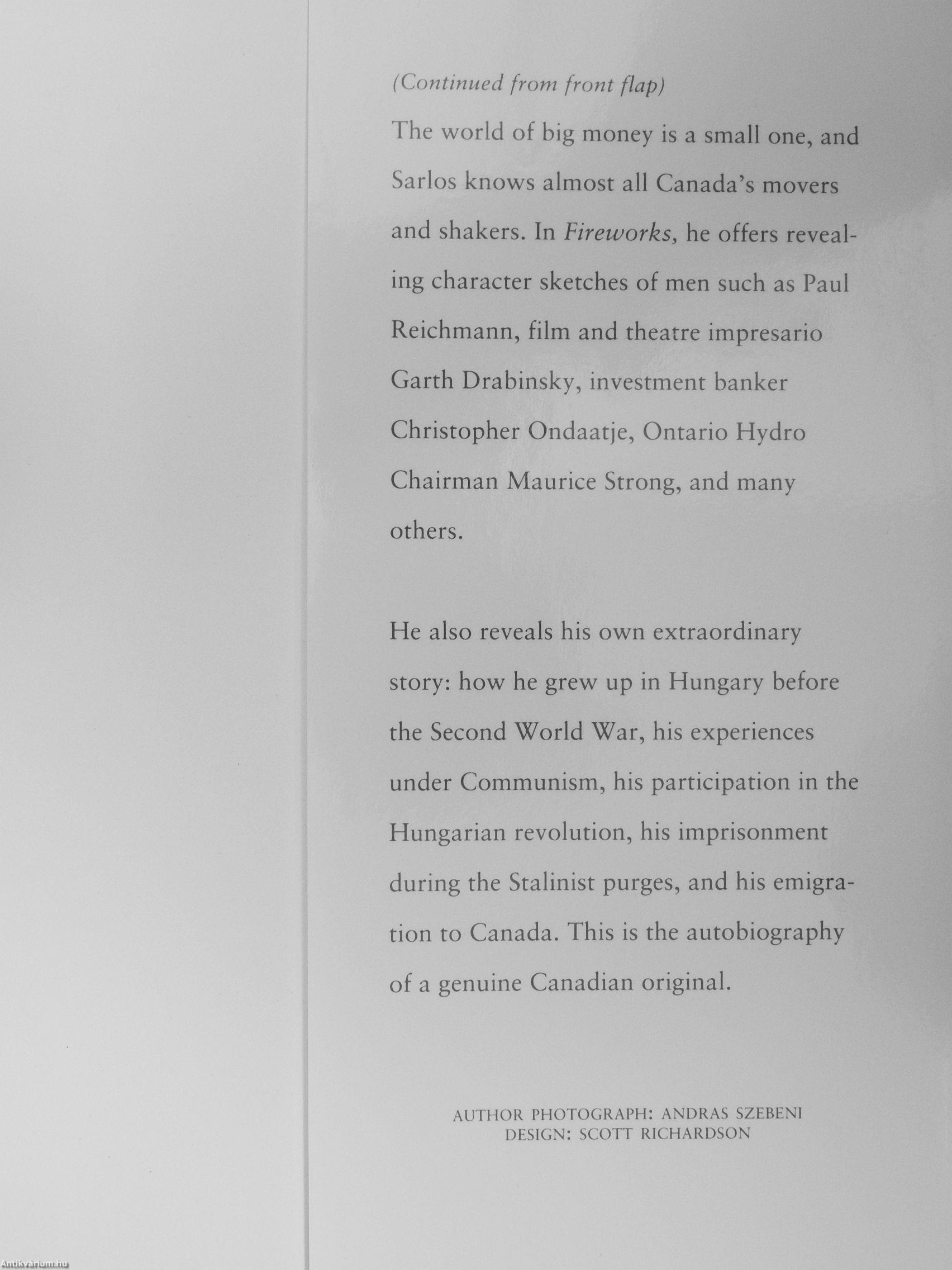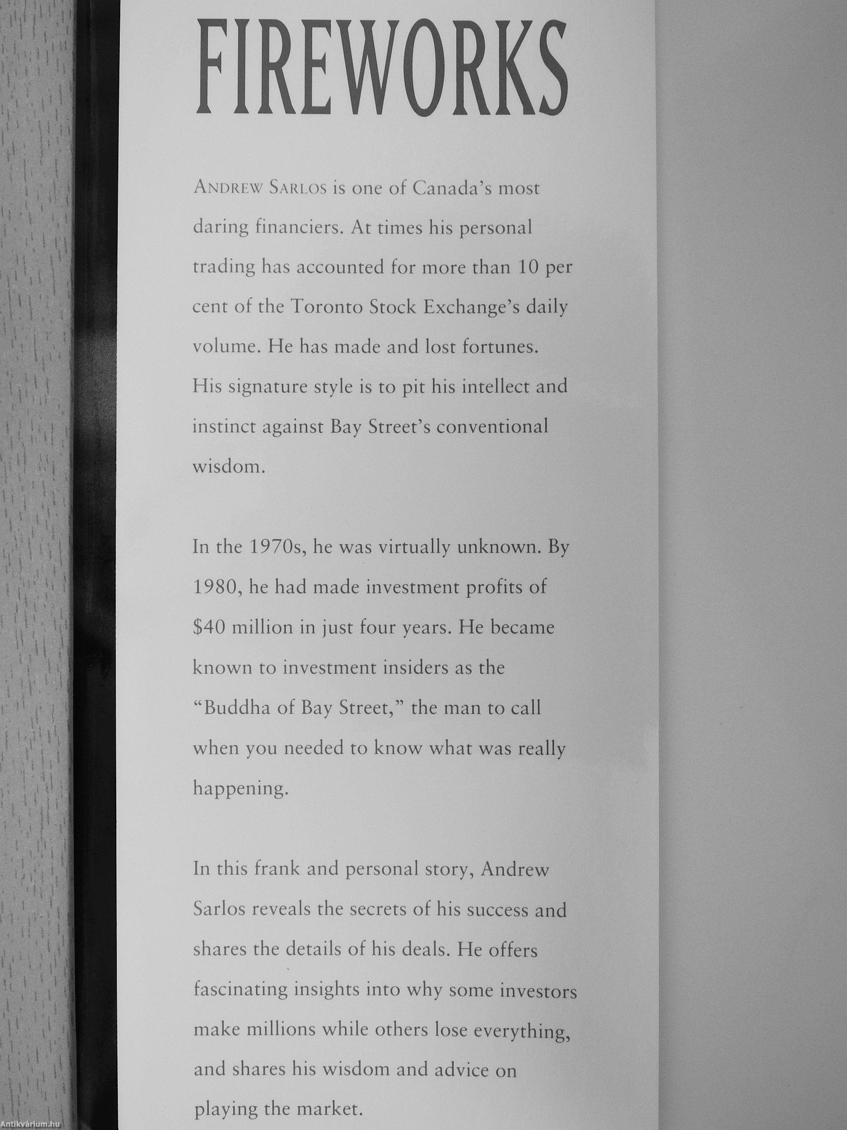 (Continued from front flap) The world of big money is a small one, and Sarlos knows almost all Canada's movers and shakers. In Firetvorks, he offers revealing character sketches of men such as Paul Reichmann, film and theatre impresario Garth Drabinsky, investment banker Christopher Ondaatje, Ontario Hydro Chairman Maurice Strong, and many others.
