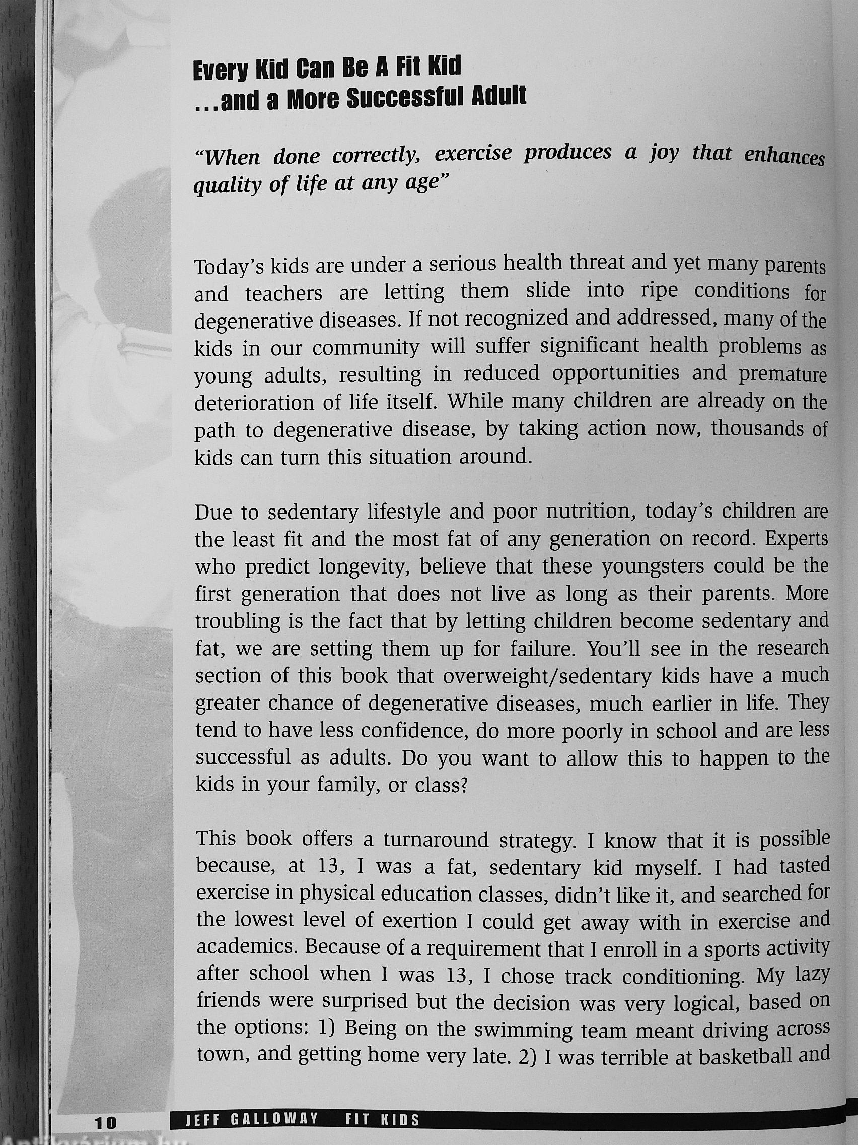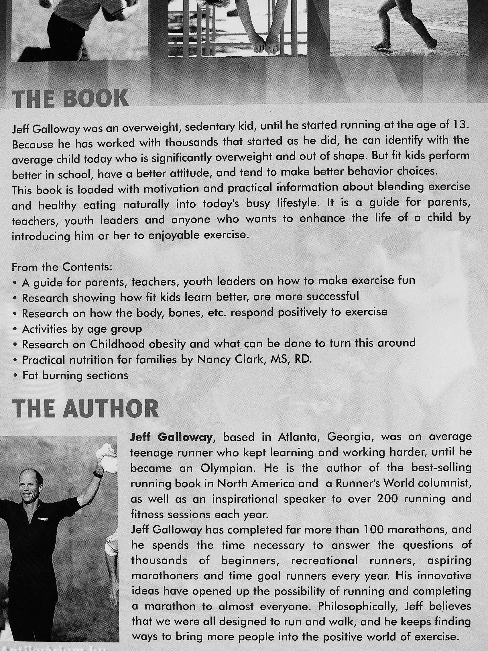Jeff Galloway was an overweight, sedentary kid, until he started running at the age of 13. Because he has worked with thousands that started as he did, he can identify with the average child today who is significantly overweight and out of shape. But fit kids perform better in school, have a better attitude, and tend to make better behavior choices. This book is loaded with motivation and practical mformation about blending exercise and healthy eating naturally into today's busy lifestyle. It is a guide for parents, teachers, youth leaders and anyone who wants to enhance the life of o child by introducing him or her to enjoyable exercise.