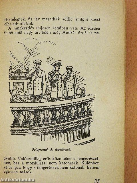 Ezenfelül még egy matróz sétált feltűzött szuronnyal a terraszon, korláttól-korlátig. Jászkun legény, s a jó ég a megmondhatója, micsoda vak véletlen szedte le fejéről a hazai tollas süveget és tette helyébe a pántlikás tengerész tányérsipkát. Ez volt a haderő képviselője, - az őrszem.