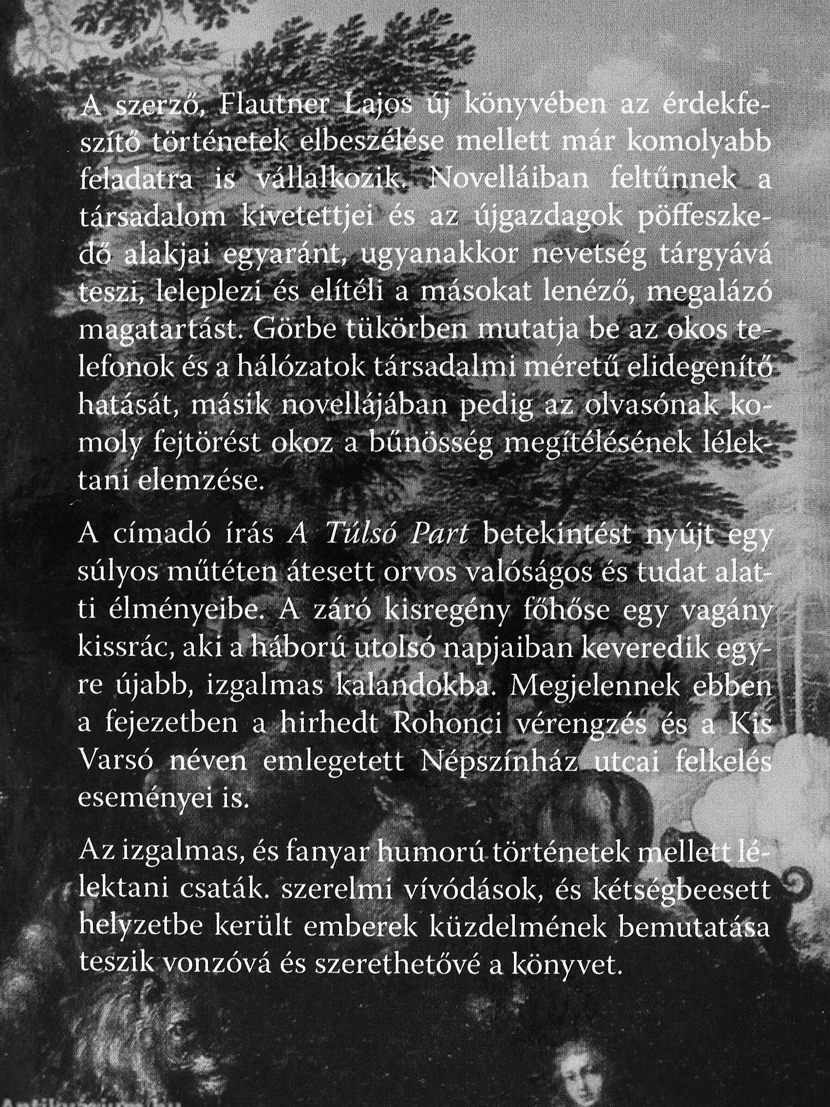 A címadó írás A fülsó Part betekintést nyújt, eg^ súlyos műtéten átesett orvos valóságos és tudat alat'í^ ti élményeibe. A záró kisregény főhőse egy vagány' kissrác, aki rfháború utolsó napjaiban keveredik egyre újabb, izgalmas kalandokba. Megjelennek ^bben a fejezetben a hírhedt Rohonci vérenjgzés ^s K^ Varsó néven emlegetett Népszínháziütcai fí eseményei is. ^f
