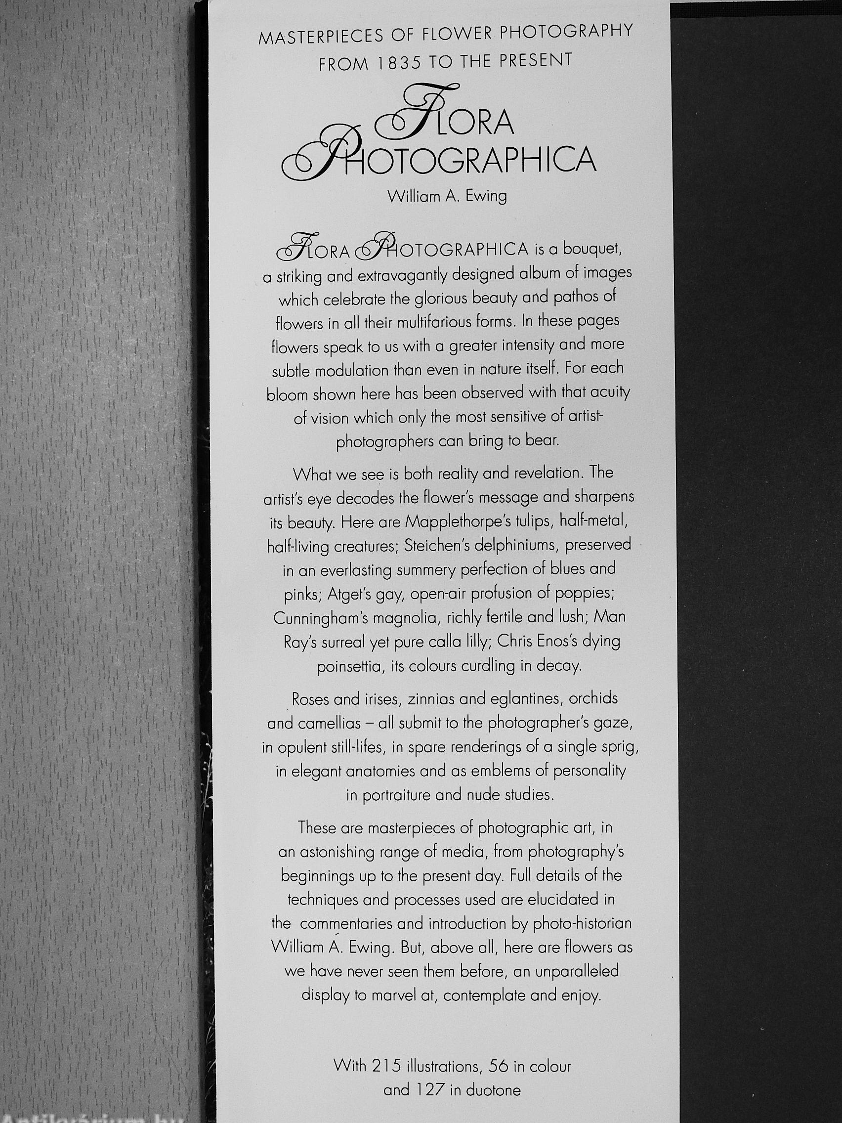 These are masterpieces of photographic art, in an astonishing range of medio, from photography's beginnings up to the present day. Full details of the techniques and processes used are elucidated in the comrrientaries and introduction by photo-historian William A. Ewing. But, above all, here ore flowers as we hove never seen them before, an unparalleled display to marvel at, contemplate and enjoy.
