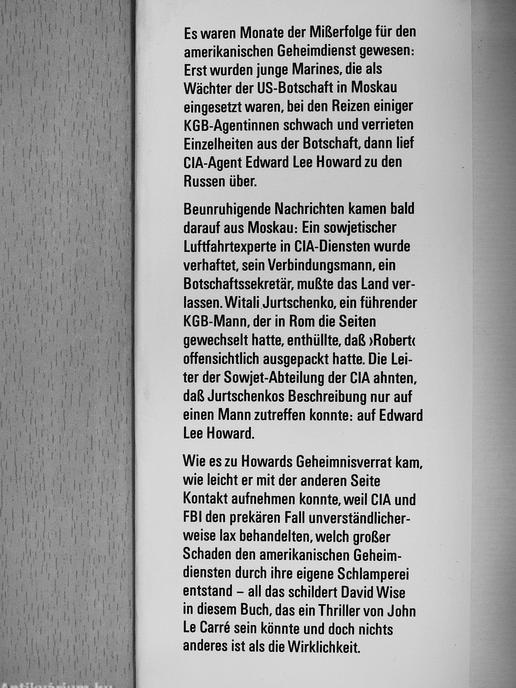 Wie es zu Howards Geheimnisverrat kam, wie leicht er mit der anderen Seite Kontakt aufnehmen konnte, weil CIA und FBI den prekären Fall unverständlicherweise lax behandelten, welch großer Schaden den amerikanischen Geheimdiensten durch ihre eigene Schlamperei entstand - all das schildert David Wise in diesem Buch, das ein Thriller von John Le Carré sein könnte und doch nichts anderes ist als die Wirklichkeit.