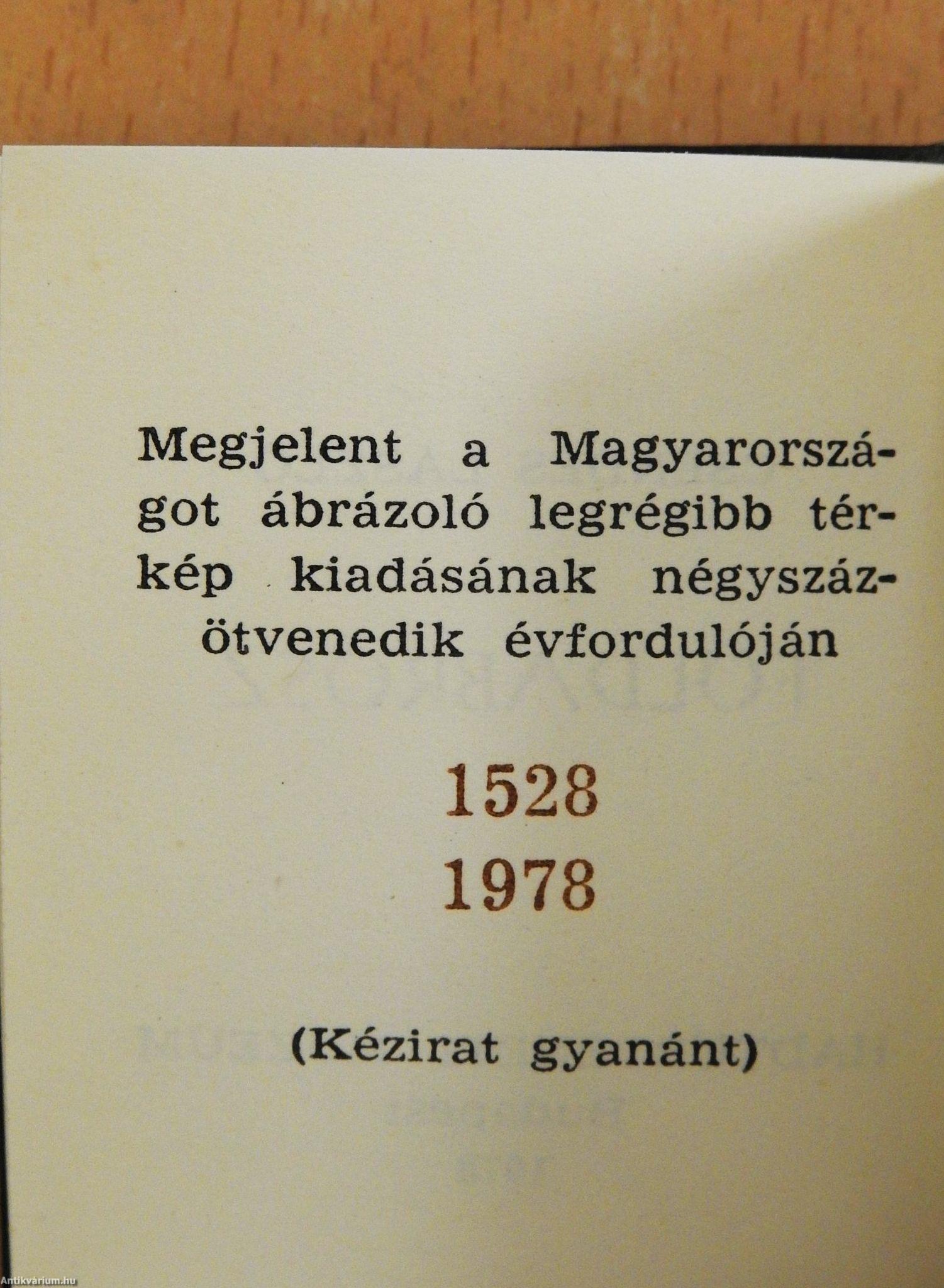 Megjegyzés: Számozatlan kiadás. Kiadott példányszám: Készült 750 példányban, ebből 100 példány számozott Könyvtervező: Malina Jenő Borító, címlapterv: Csicsely János Néhány fekete-fehér térképpel. Megjelent a Magyarországot ábrázoló legrégibb térkép kiadásának négyszázötvenedik évfordulóján 1528-1978 (Kézirat gyanánt) A könyv pontos mérete: 48 x 60 mm