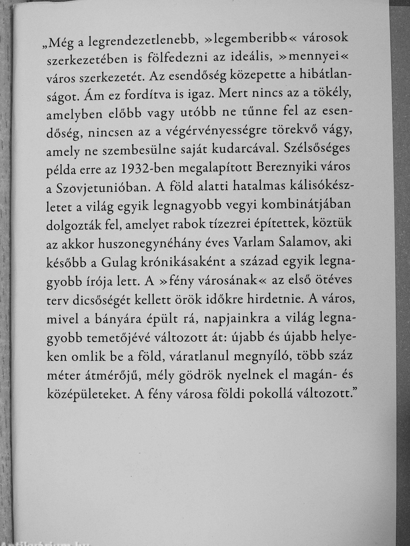„Még a legrendezetlenebb, »legemberibb« városok szerkezetében is fölfedezni az ideális, »mennyei« város szerkezetét. Az esendőség közepette a hibátlanságot. Ám ez fordítva is igaz. Mert nincs az a tökély, amelyben előbb vagy utóbb ne tűnne fel az esendőség, nincsen az a végérvényességre törekvő vágy, amely ne szembesülne saját kudarcával. Szélsőséges példa erre az 1932-ben megalapított Bereznyiki város a Szovjetunióban. A föld alatti hatalmas kálisókész-letet a világ egyik legnagyobb vegyi kombinátjában dolgozták fel, amelyet rabok tízezrei építettek, köztük az akkor huszonegynéhány éves Variam Salamov, aki később a Gulag krónikásaként a század egyik legnagyobb írója lett. A »fény városának« az első ötéves terv dicsőségét kellett örök időkre hirdetnie. A város, mivel a bányára épült rá, napjainkra a világ legnagyobb temetőjévé változott át: újabb és újabb helyeken omlik be a föld, váratlanul megnyíló, több száz méter átmérőjű, mély gödrök nyelnek el magán- és középületeket. A fény...