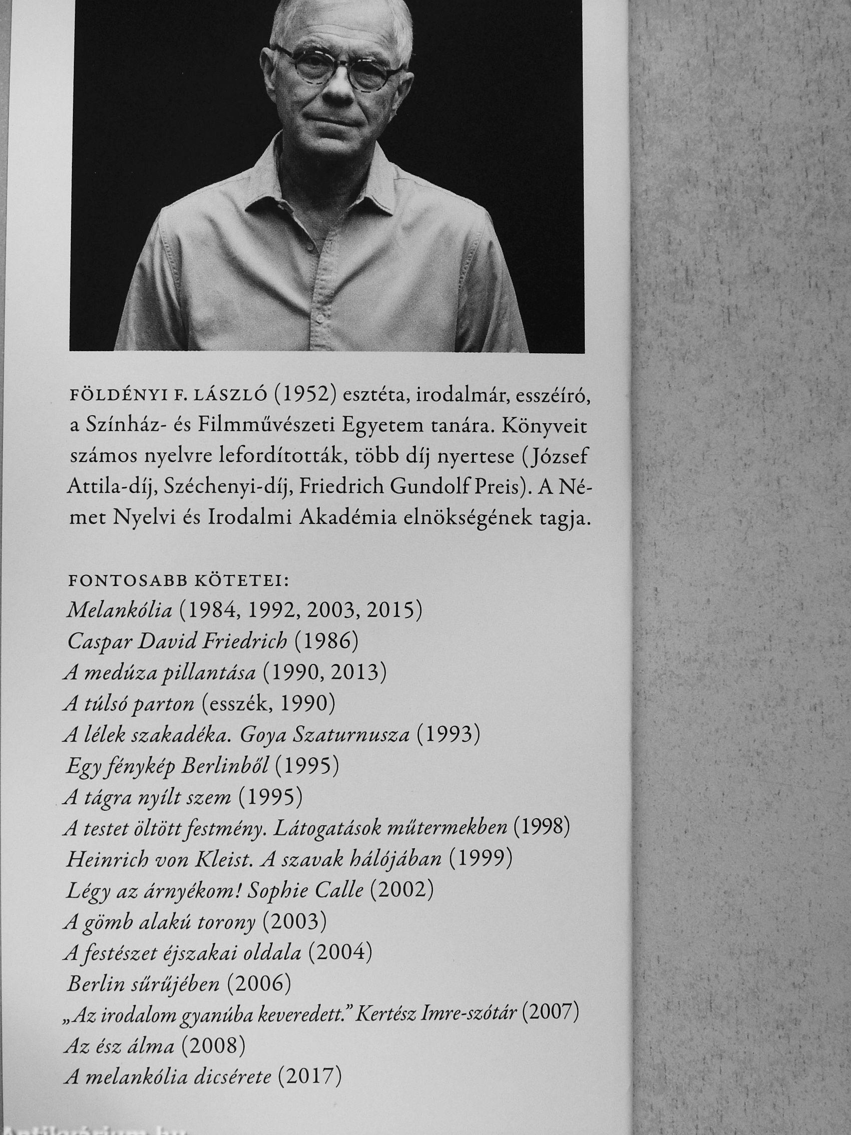 földényi f. lászló (1952) esztéta, irodalmár, esszéíró, a Színház- és Filmművészeti Egyetem tanára. Könyveit számos nyelvre lefordították, több díj nyertese (József Attila-díj, Széchenyi-díj, Friedrich Gundolf Preis). A Német Nyelvi és Irodalmi Akadémia elnökségének tagja.
