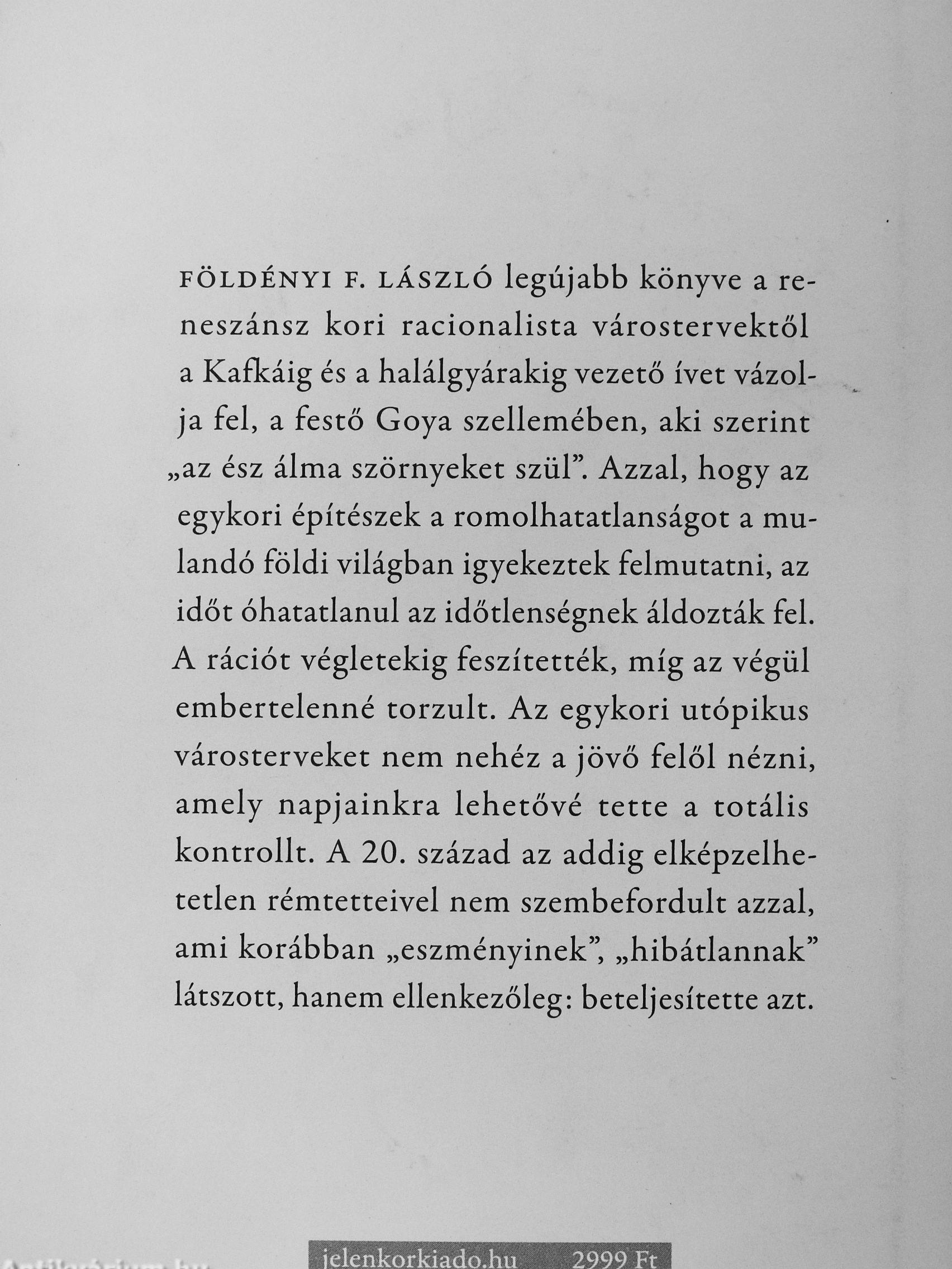 FÖLDÉNYI F. LÁSZLÓ legújabb könyve a reneszánsz kori racionalista várostervektől a Kafkáig és a halálgyárakig vezető ívet vázolja fel, a festő Goya szellemében, aki szerint „az ész álma szörnyeket szül". Azzal, hogy az egykori építészek a romolhatatlanságot a mulandó földi világban igyekeztek felmutatni, az időt óhatatlanul az időtlenségnek áldozták fel. A rációt végletekig feszítették, míg az végül embertelenné torzult. Az egykori utópikus városterveket nem nehéz a jövő felől nézni, amely napjainkra lehetővé tette a totális kontrollt. A 20. század az addig elképzelhetetlen rémtetteivel nem szembefordult azzal, ami korábban „eszményinek", „hibátlannak" látszott, hanem ellenkezőleg: beteljesítette azt.