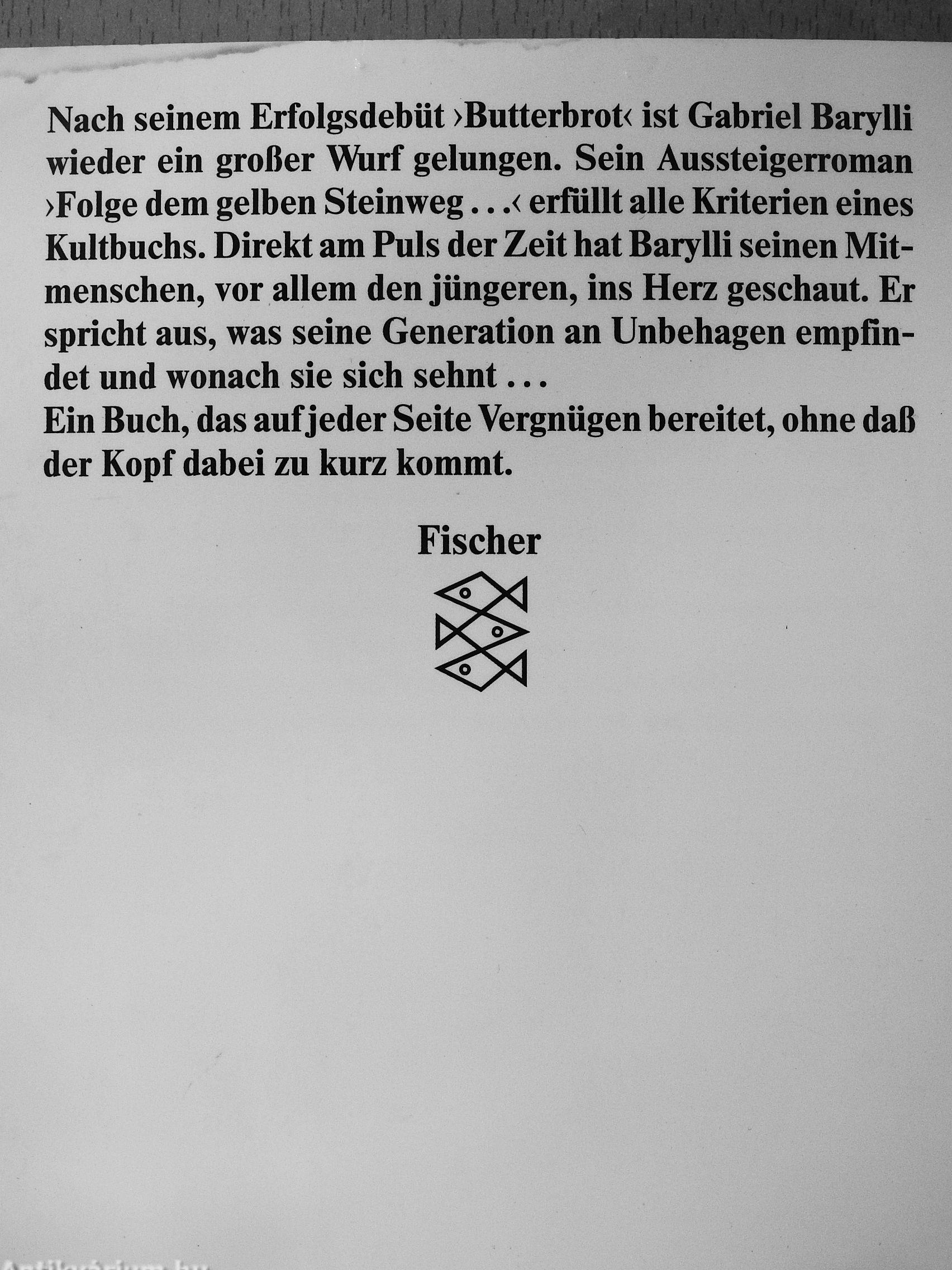 Nach seinem Erfolgsdebüt >Butterbrot< ist Gabriel Barylli wieder ein großer Wurf gelungen. Sein Aussteigerroman >Folge dem gelben Steinweg .< erfüllt alle Kriterien eines Kultbuchs. Direkt am Puls der Zeit hat Barylli seinen Mitmenschen, vor allem den jüngeren, ins Herz geschaut. Er spricht aus, was seine Generation an Unbehagen empfindet und wonach sie sich sehnt Ein Buch, das auf jeder Seite Vergnügen bereitet, ohne daß der Kopf dabei zu kurz kommt.