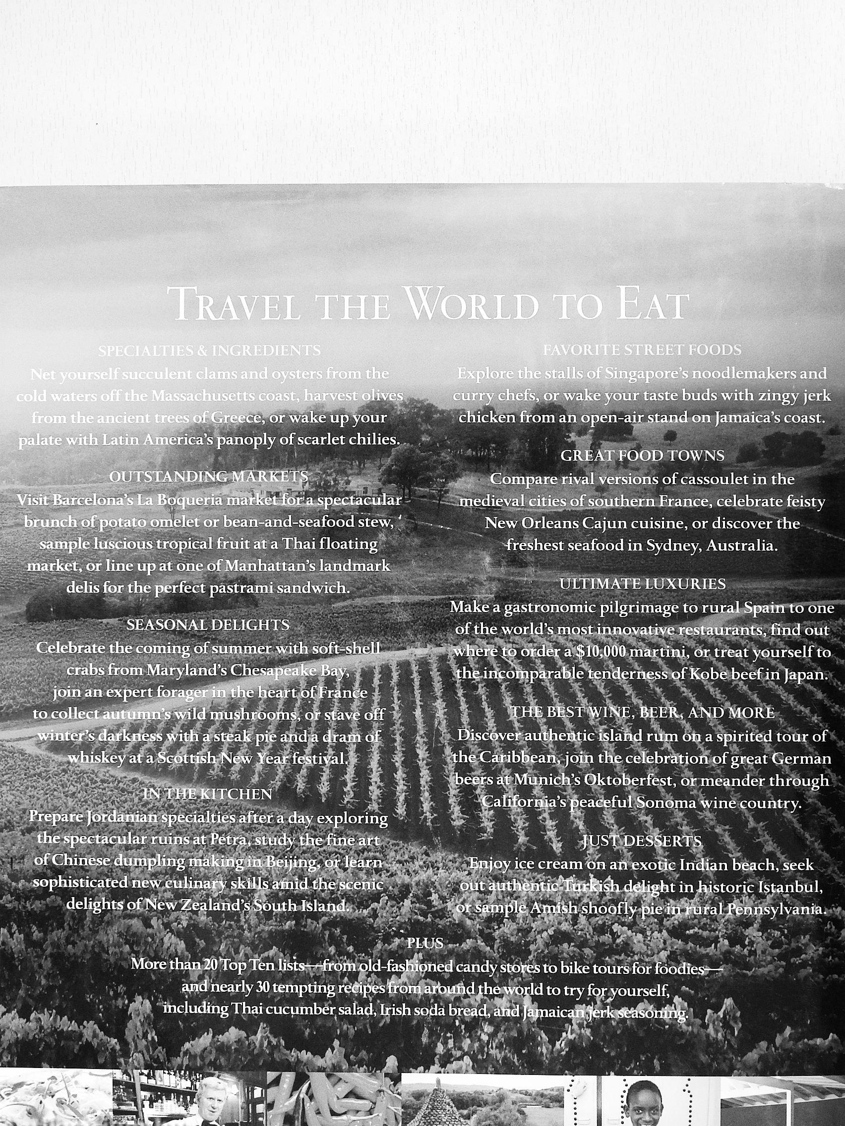 Open this book and you'll find that the world , really is your oyster .and your truffle, your clam, your Peking duck, your German sausage, your Scottish single-malt whiskey, and your Belgian chocolate cake!