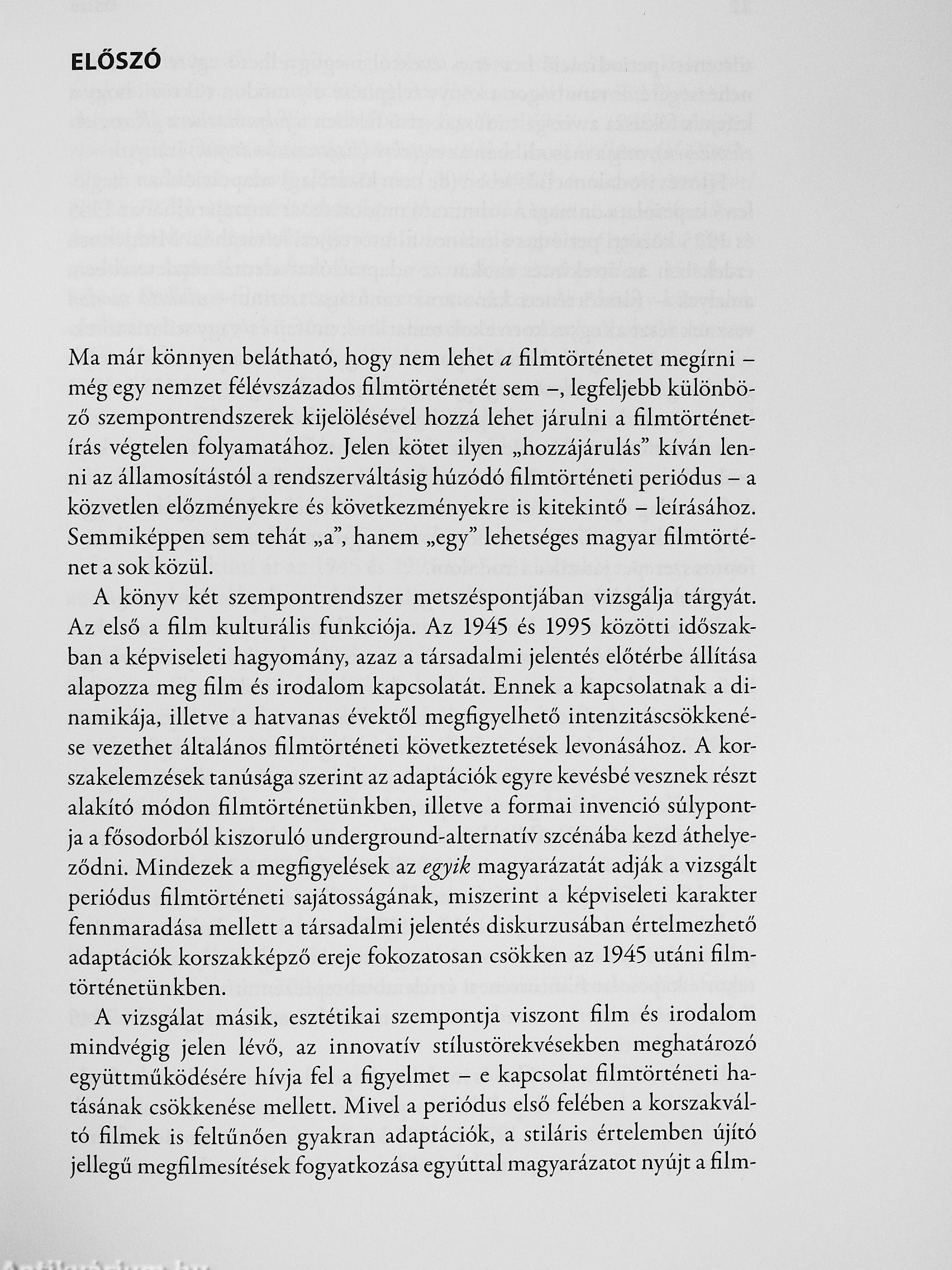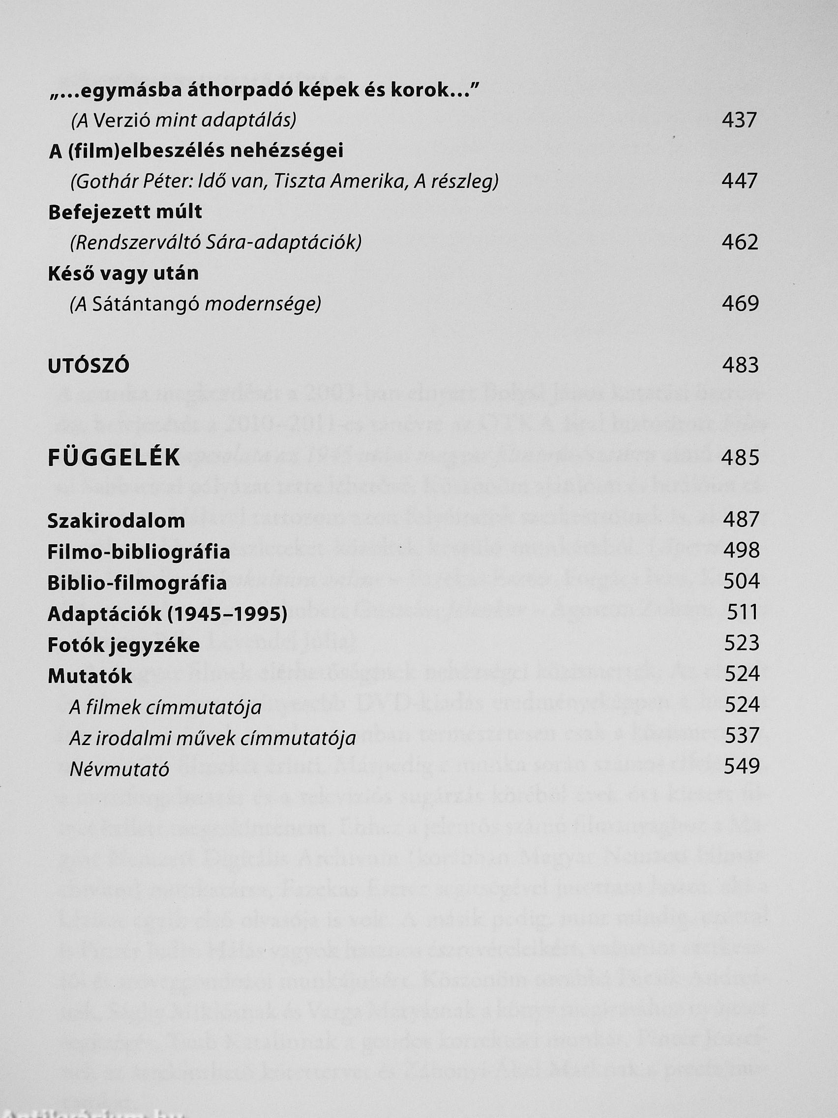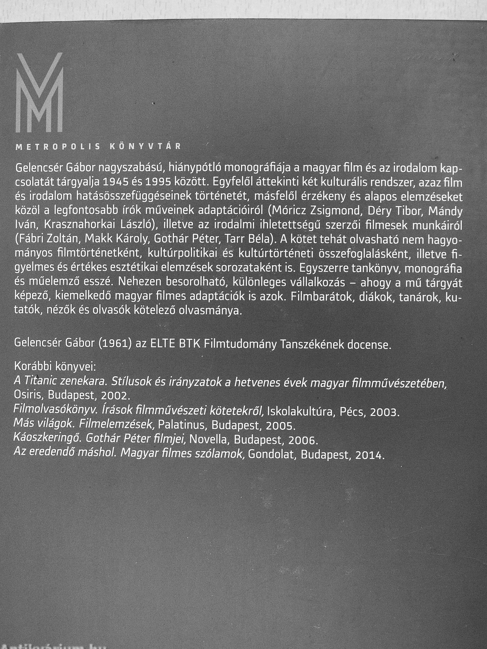 Gelencsér Gábor nagyszabású, hiánypótló monográfiája a magyar film és az irodalom kapcsolatát tárgyalja 1945 és 1995 között. Egyfelől áttekinti két kulturális rendszer, azaz film és irodalom hatásösszefüggéseinek történetét, másfelől érzékeny és alapos elemzéseket közöl a legfontosabb írók műveinek adaptációiról (Móricz Zsigmond, Déry Tibor, Mándy Iván, Krasznahorkai László), illetve az irodalmi ihletettségű szerzői filmesek munkáiról (Fábri Zoltán, Makk Károly, Gothár Péter, Tarr Béla). A kötet tehát olvasható nem hagyományos filmtörténetként, kultúrpolitikai és kultúrtörténeti összefoglalásként, illetve figyelmes és értékes esztétikai elemzések sorozataként is. Egyszerre tankönyv, monográfia és műelemző esszé. Nehezen besorolható, különleges vállalkozás - ahogy a mű tárgyát képező, kiemelkedő magyar filmes adaptációk is azok. Filmbarátok, diákok, tanárok, kutatók, nézők és olvasók kötelező olvasmánya.
