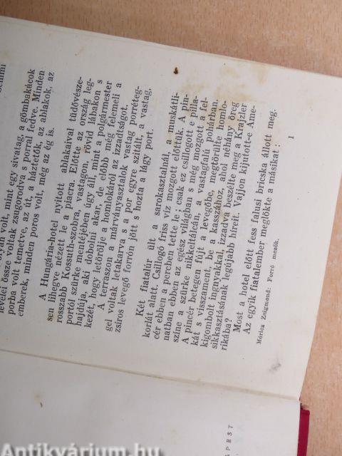 Két fiatalúr ült a sarokasztalnál, a muskátlikorlát alatt. Csillogó friss víz mozgott előttük. A pincér ebben a percben tette le; csak ez csillogott e pillanatban ebben az egész világban s még mozgott a felszíne a szürke nikeltálcán, a vastagfalú pohárban. A pincér betegen fújt a levegőbe, megtörülte homlokát s visszament, be a kasszához, ahol néhány öreg kigombolt ingnyakkal, izzadva beszélte meg a Krajzler sikkasztásának legújabb híreit. Vajjon kijutott-e Amerikába?