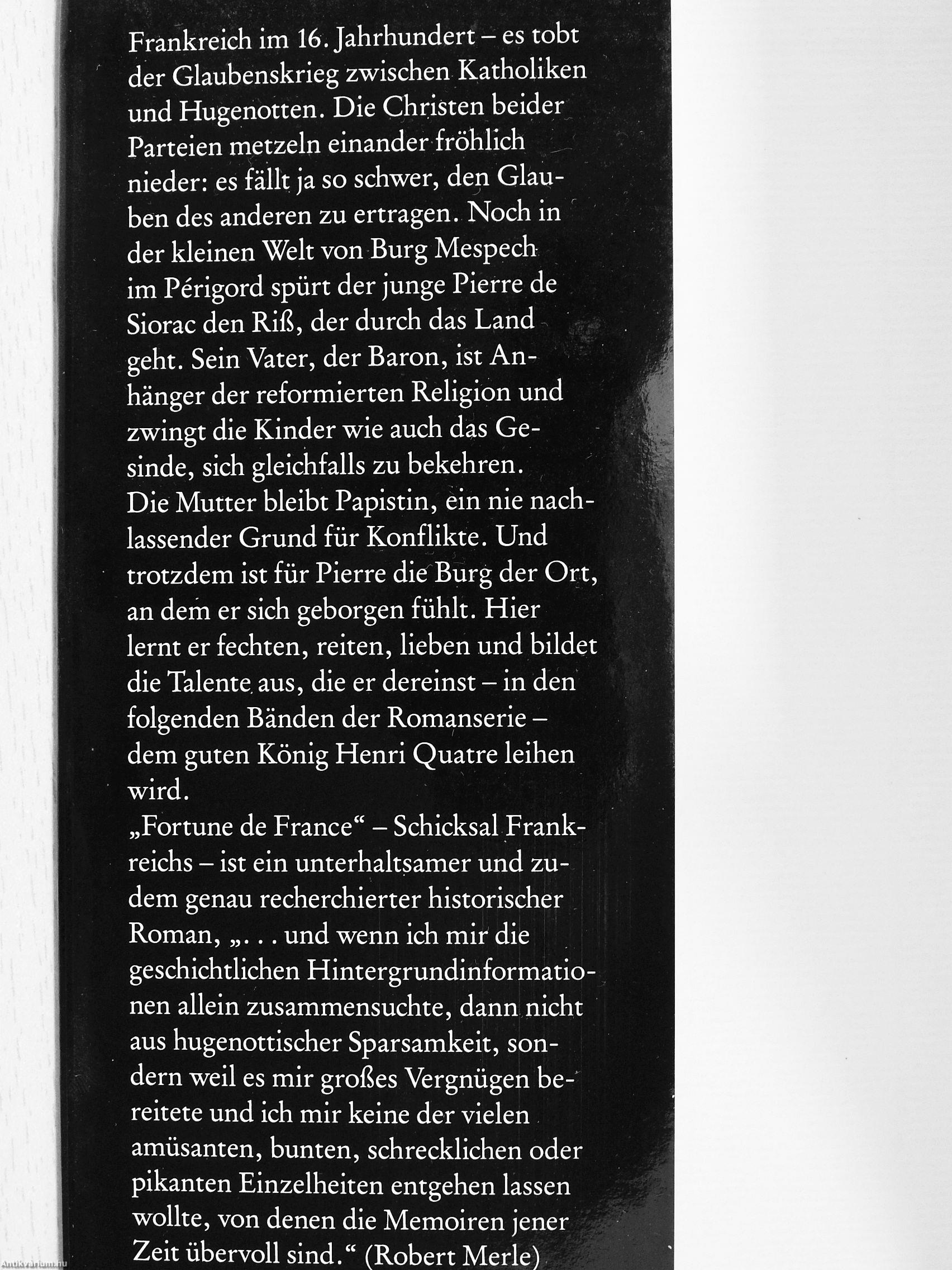 „Fortune de France" - Schicksal Frankreichs - ist ein unterhaltsamer und zudem genau recherchierter historischer Roman, „ und wenn ich mir die geschichtlichen Hintergrundinformationen allein zusammensuchte, dann nicht aus hugenottischer Sparsamkeit, sondern weil es mir großes Vergnügen bereitete und ich mir keine der vielen amüsanten, bunten, schrecklichen oder pikanten Einzelheiten entgehen lassen wollte, von denen die Memoiren jener Zeit übervoll sind." Robert Merie).