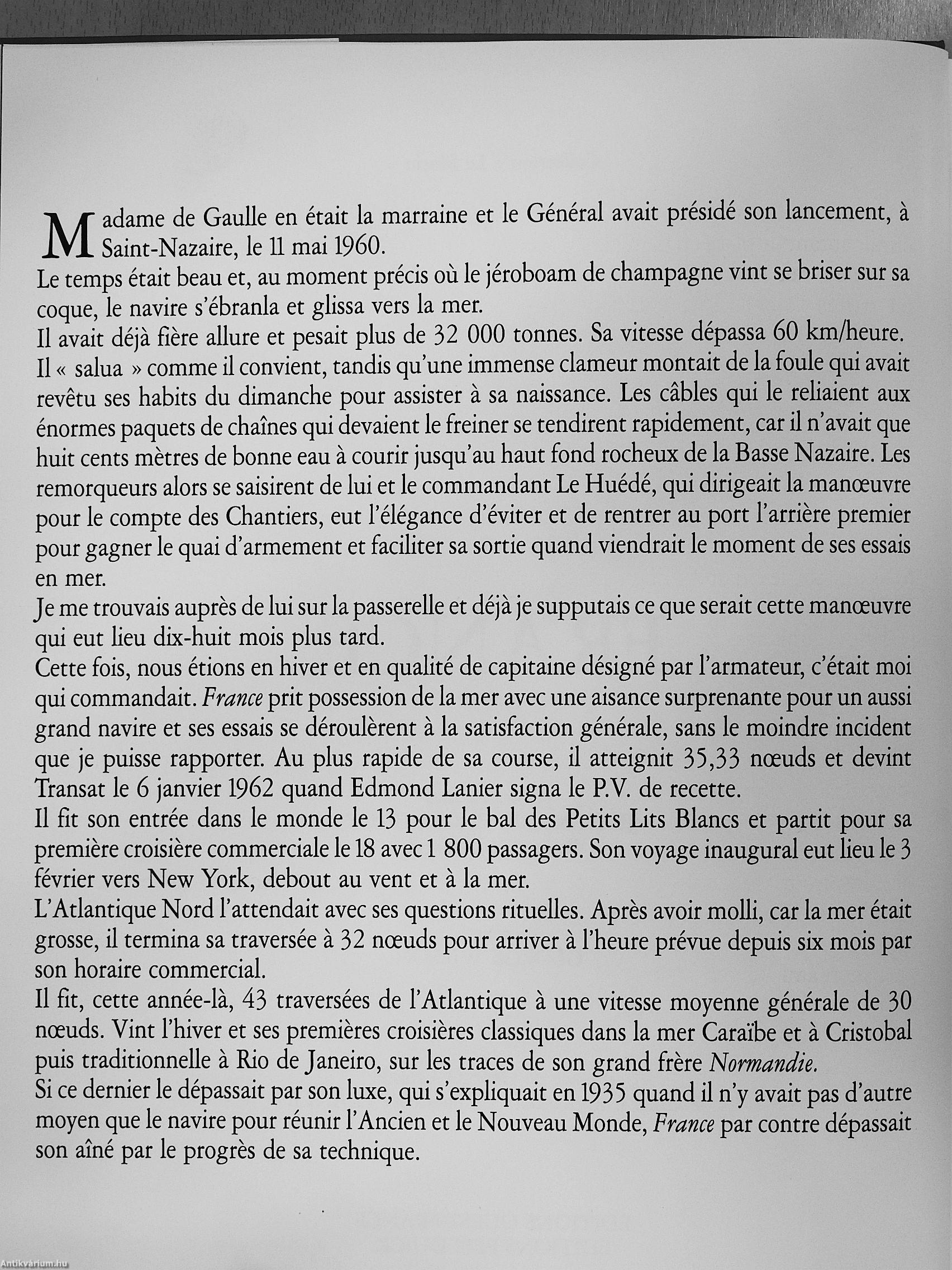FRANCE, qui fit la fierté de la France avant d'etre, sans doute, la cause de sa plus grande tristesse. FRANCE, qui a porté le bleu, le blanc, le rouge sur toutes les mers du globe. FRANCE, que ceux qui ont eu la chance, ou l'honneur, de fouler les ponts, parcourir les coursives, admirer les salons, flâner dans les boutiques, ne pourront jamais oublier. FRANCE, que la France, un jour, a abandonné, revit en ces pages comme s'il faisait encore intégralement partie de notre patrimoine.