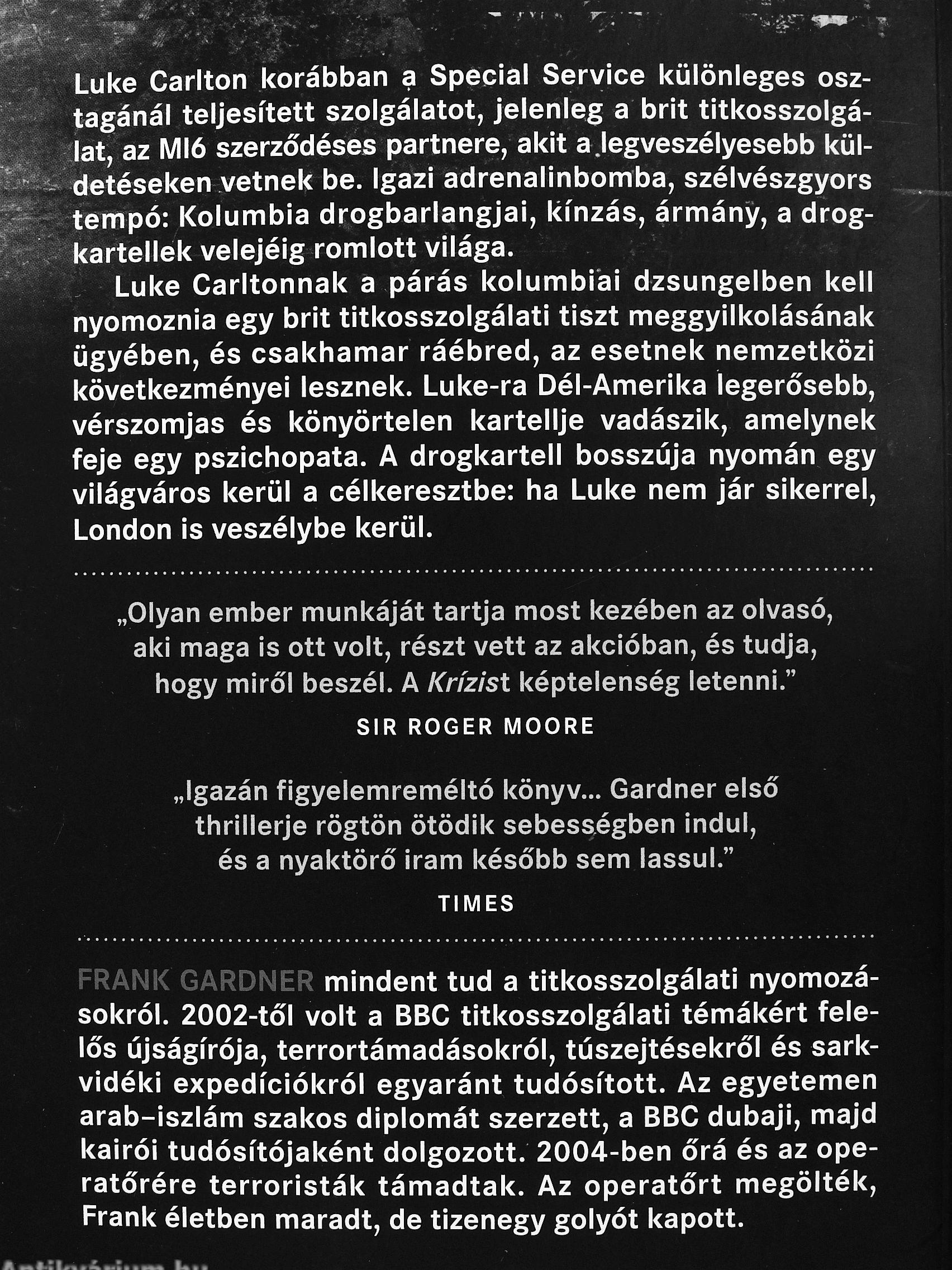 FRANK GARDNER mindent tud a titkosszolgálati nyomozásokról. 2002-től volt a BBC titkosszolgálati témákért felelős újságírója, terrortámadásokról, túszejtésekről és sarkvidéki expedíciókról egyaránt tudósított. Az egyetemen arab-iszlám szakos diplomát szerzett, a BBC dubaji, majd l<airói tudósítójaként dolgozott. 2004-ben őrá és az operatőrére terroristák támadtak. Az operatőrt megölték. Frank életben maradt, de tizenegy golyót kapott.