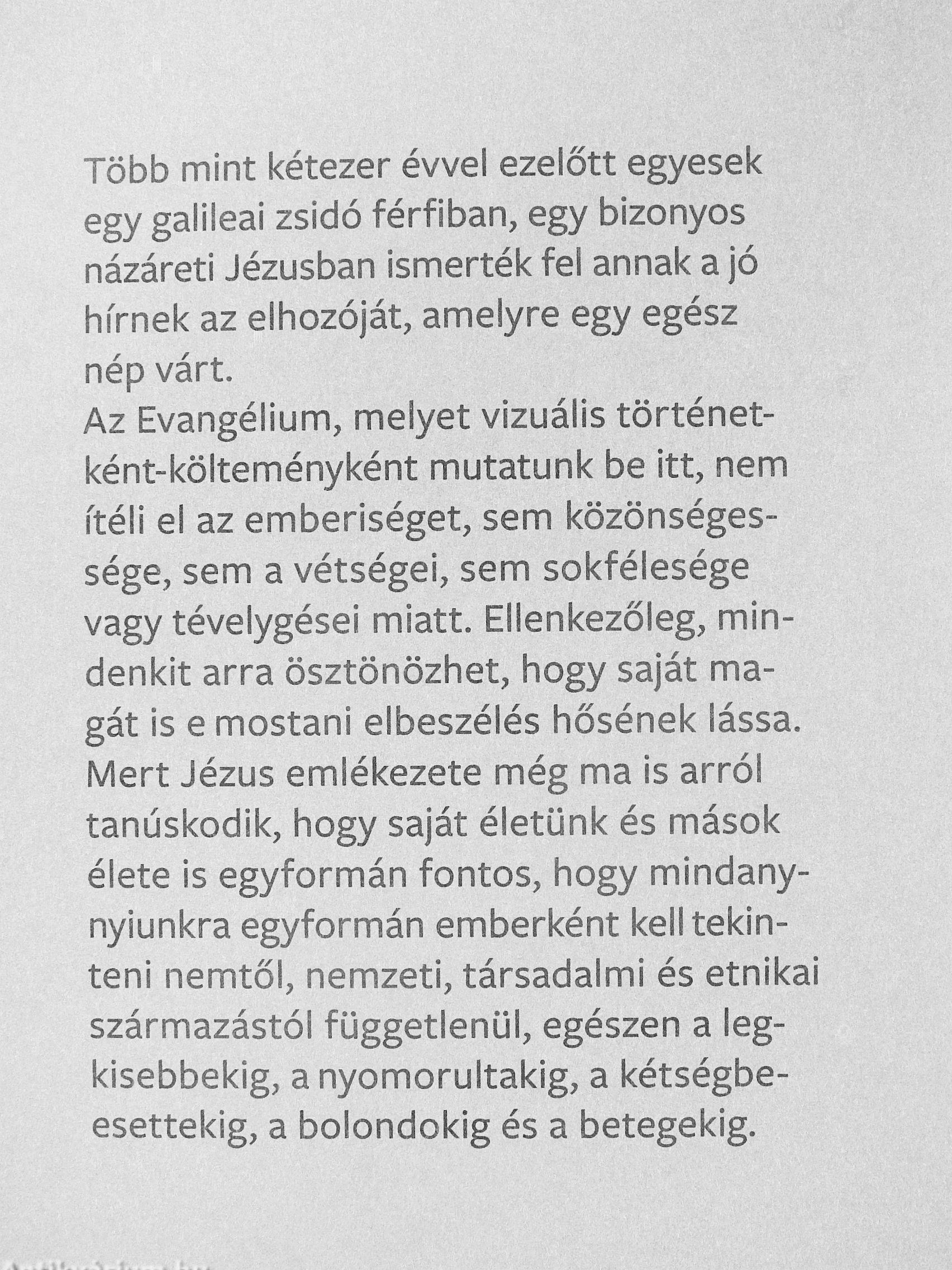 Az Evangélium, melyet vizuális történet-ként-költeményként mutatunk be itt, nem ítéli el az emberiséget, sem közönséges-sége, sem a vétségei, sem sokfélesége vagy tévelygései miatt. Ellenkezőleg, mindenkit arra ösztönözhet, hogy saját magát is e mostani elbeszélés hősének lássa. Mert Jézus emlékezete még ma is arról tanúskodik, hogy saját életünk és mások élete is egyformán fontos, hogy mindany-nyiunkra egyformán emberként kell tekinteni nemtől, nemzeti, társadalmi és etnikai származástól függetlenül, egészen a legkisebbekig, a nyomorultakig, a kétségbeesettekig, a bolondokig és a betegekig.