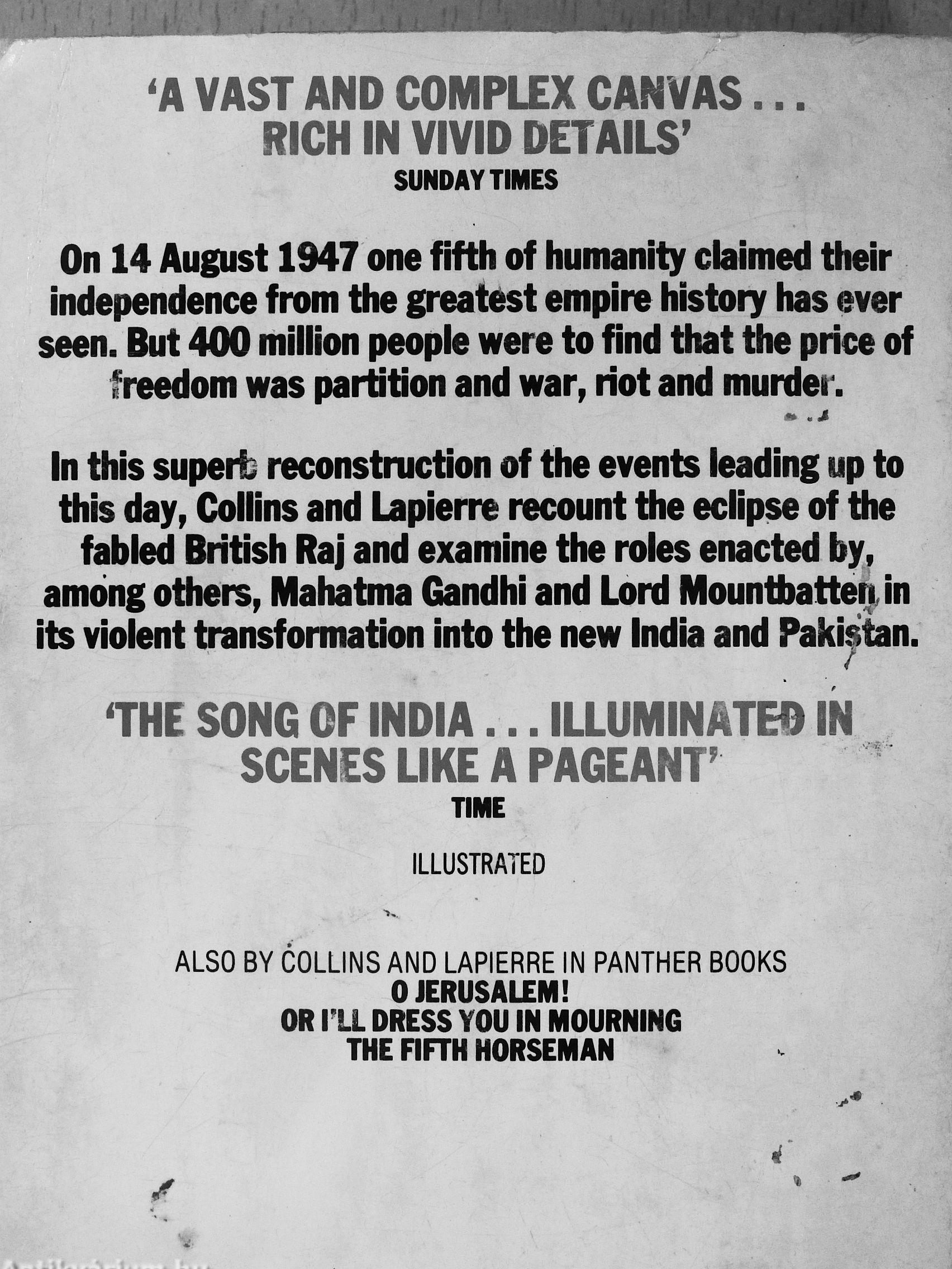 In this superl> reconstruction of the events leading up to this day, Collins and Lapierre recount the eclipse of the fabled British Raj and examine the roles enacted by, among others, Mahatma Gandhi and Lord Mountbatte^in