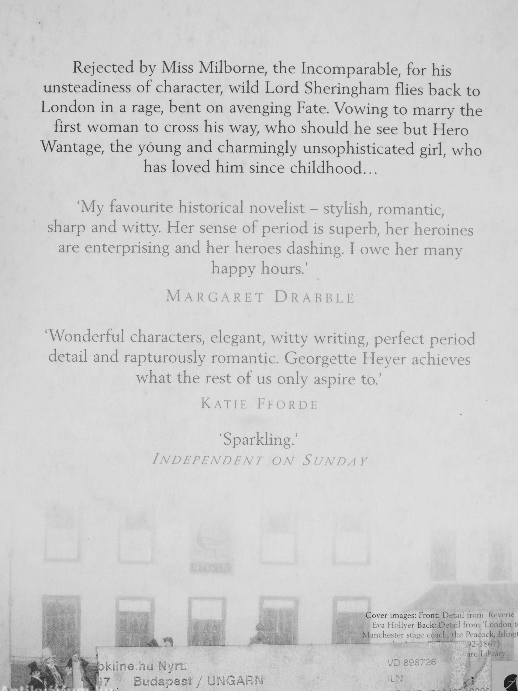 Rejected by Miss Milborne, the Incomparable, for his unsteadiness of character, wild Lord Sheringham flies back to London in a rage, bent on avenging Fate. Vowing to marry the