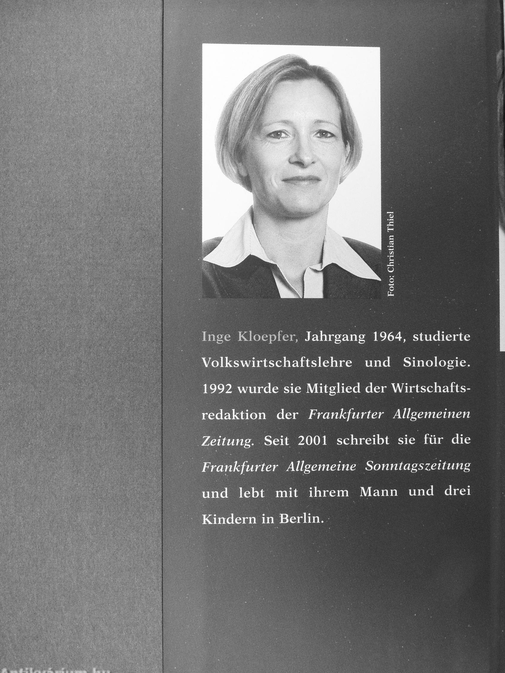 Inge Kloepfer, Jahrgang 1964, studierte Volkswirtschaftslehre und Sinologie. 1992 wurde sie Mitglied der Wirtschaftsredaktion der Frankfurter Allgemeinen Zeitung. Seit 2001 schreibt sie für die Frankfurter Allgemeine Sonntags zeit ung und lebt mit ihrem Mann und drei Kindern in Berlin.