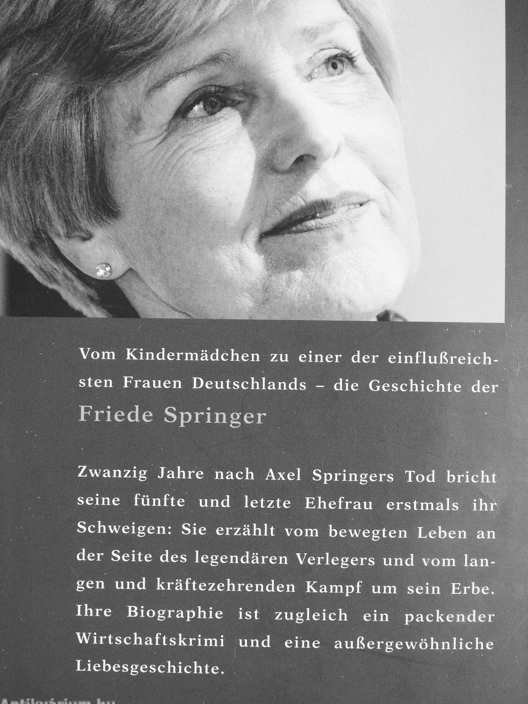 Zwanzig Jahre nach Axel Springers Tod bricht seine fünfte und letzte Ehefrau erstmals ihr Schweigen: Sie erzählt vom bewegten Leben an der Seite des legendären Verlegers und vom langen und kräftezehrenden Kampf um sein Erbe. Ihre Biographie ist zugleich ein packender Wirtschaftskrimi und eine außergewöhnliche Liebesgeschichte.