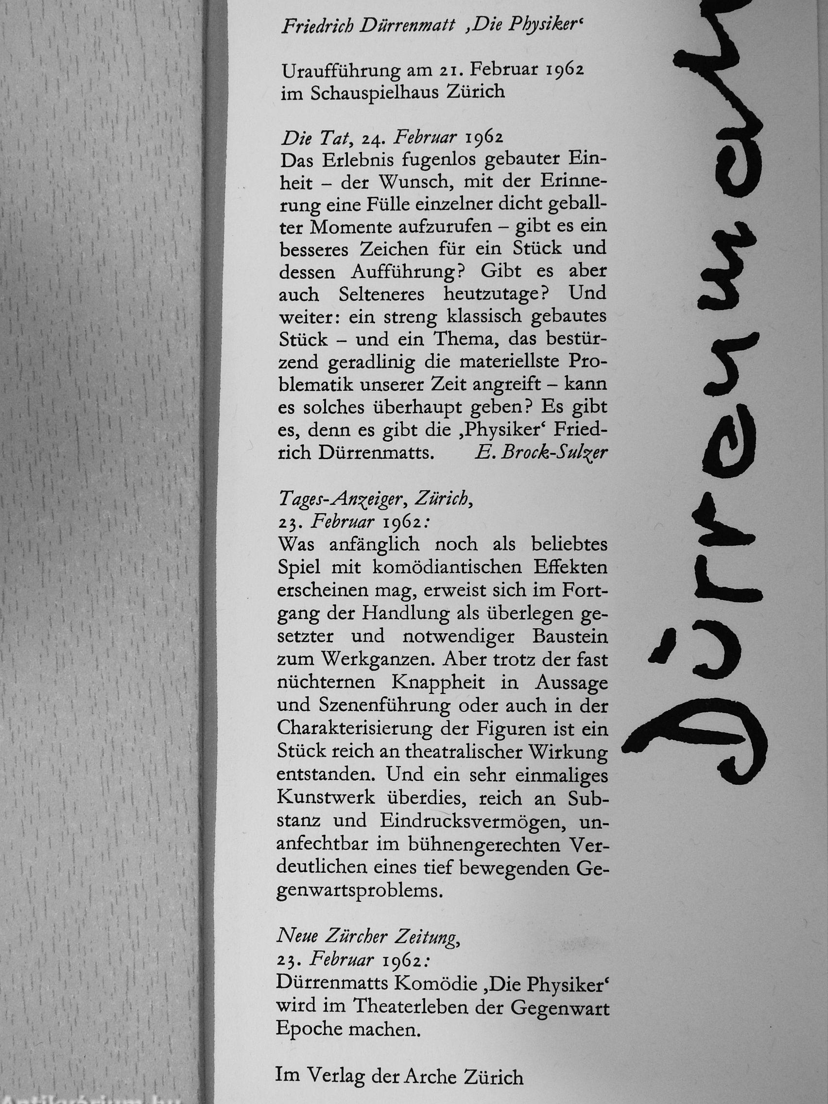Die Tat, 24. Februar 1962 Das Erlebnis fugenlos gebauter Einheit - der Wunsch, mit der Erinnerung eine Fülle einzelner dicht geballter Momente aufzurufen - gibt es ein besseres Zeichen für ein Stück und dessen Aufführung? Gibt es aber auch Selteneres heutzutage? Und weiter: ein streng klassisch gebautes Stück - und ein Thema, das bestürzend geradlinig die materiellste Problematik unserer Zeit angreift - karm es solches überhaupt geben? Es gibt es, denn es gibt die ,Physiker' Friedrich Dürrenmatts. E. Brock-Suls^er
