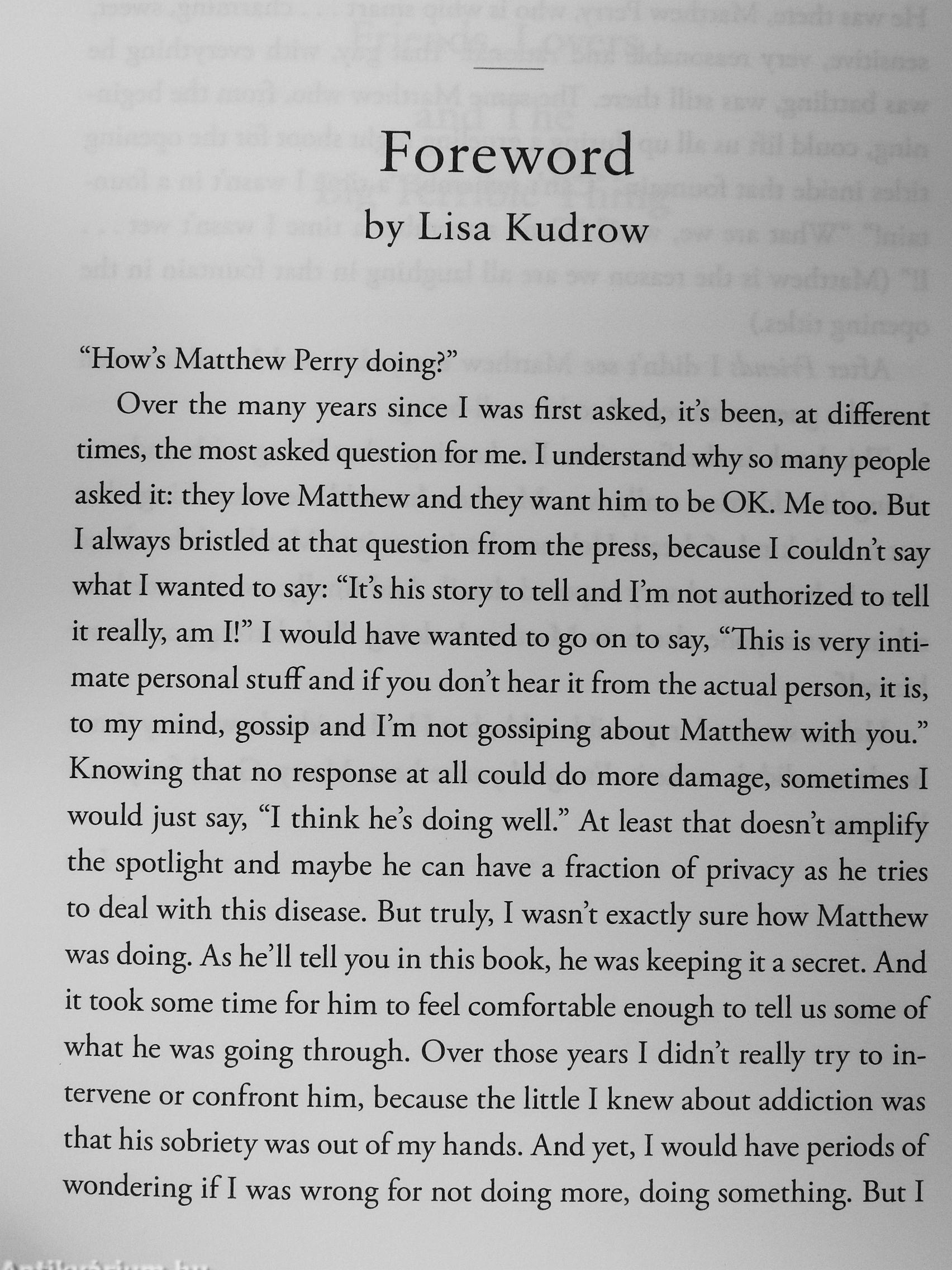 So begins the riveting story of acclaimed actor Matthew Perry, taking us on his journey from childhood ambition to fame to addiction and recovery, and introducing us along the way to five-year-old Matthew, who travelled from Montreal to Los Angeles, shuffling between his separated parents; fourteen-year-old Matthew, who was a nationally ranked tennis star in Canada; and twenty-four-year-old Matthew, who nabbed a coveted role as a lead cast member on the talked-about pilot then called Friends Like Us