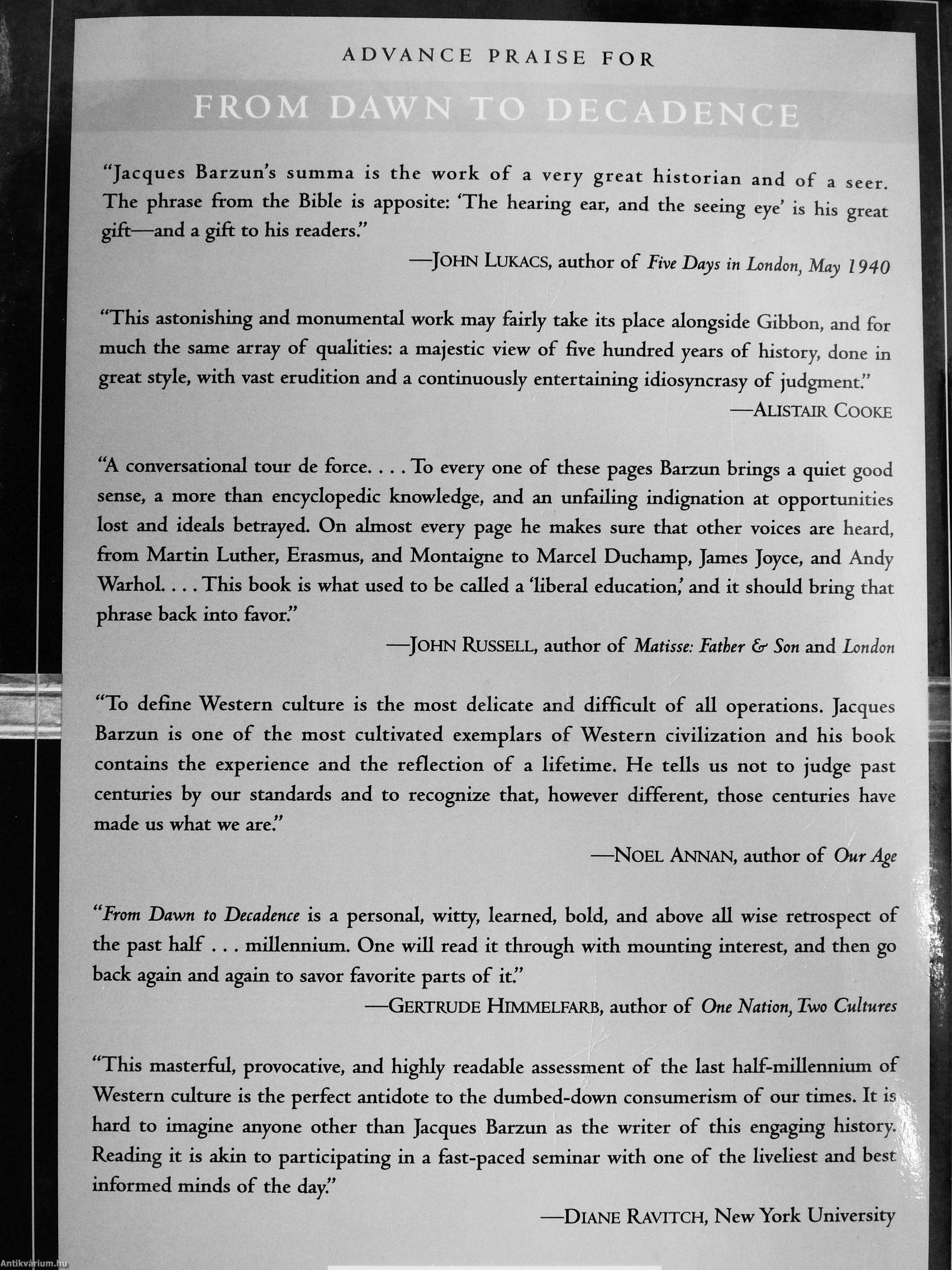 "What has been the value, to the world, of the American Revolution of the 1770s? And of the French Revolution that began in 1789? Jacques Barzun has addressed these questions, and the questions which these questions raised, repeatedly—in an extraordinary series of books (not to mention his lectures, informal talks, and conversations) over the course of half a century and more. . . . No one else could put together such a rich and diverse summing-up of everything as From Dawn to Decadence"
