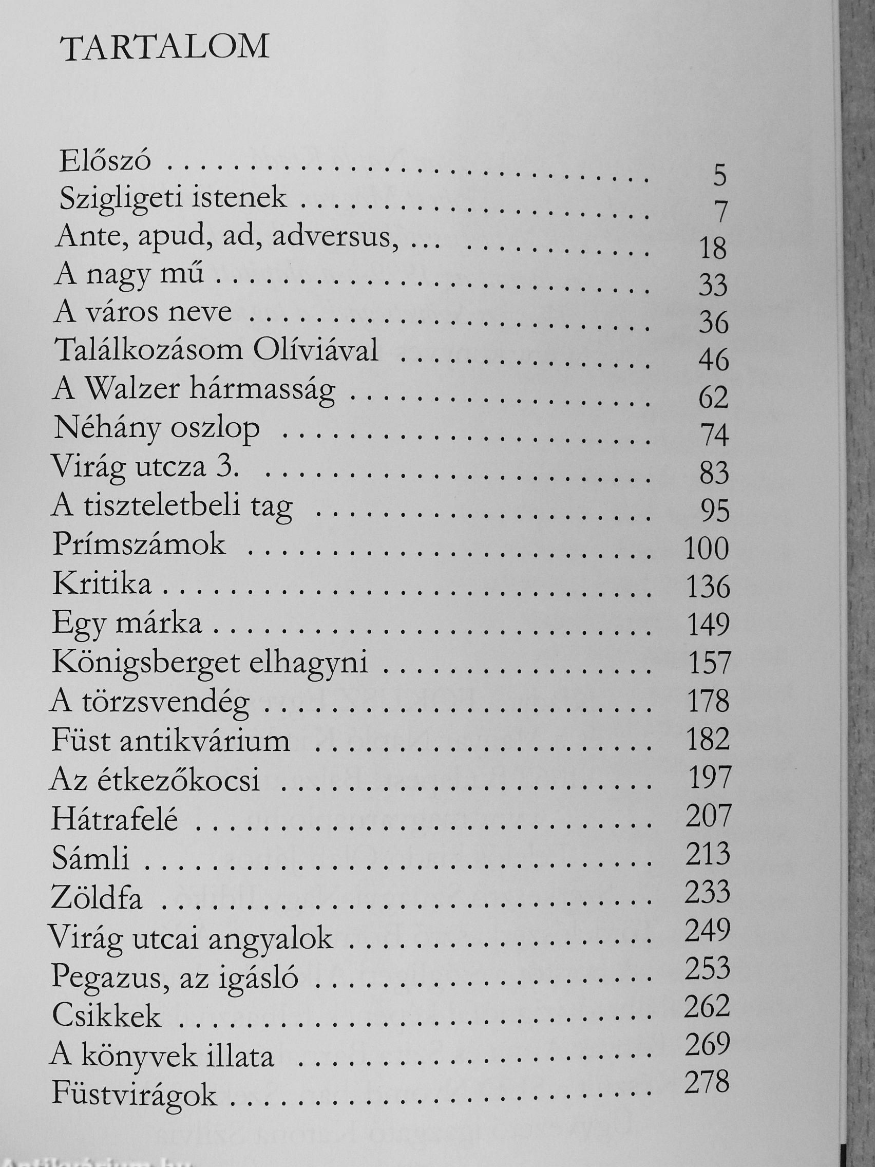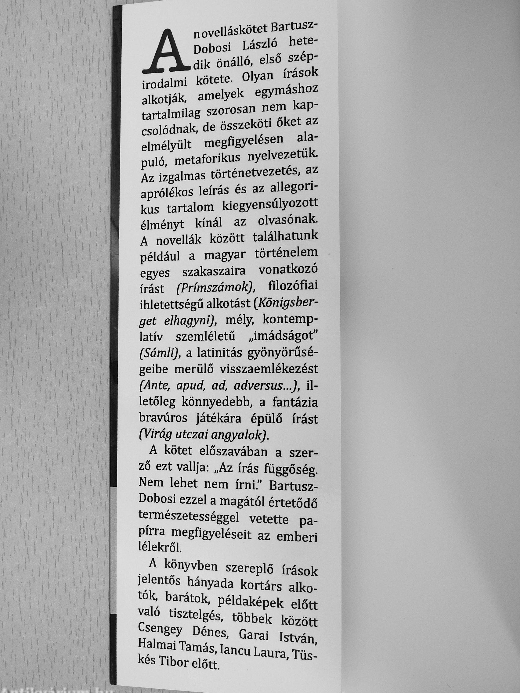 A novelláskötet Bartusz-Dobosi László hetedik önálló, első szépirodalmi kötete. Olyan írások alkotják, amelyek egymáshoz tartalmilag szorosan nem kapcsolódnak, de összeköti őket az elmélyült megfigyelésen alapuló, metaforikus nyelvezetük Az izgalmas történetvezetés, az aprólékos leírás és az allegorikus tartalom kiegyensúlyozott élményt kínál az olvasónak A novellák között találhatunk például a magyar történelem egyes szakaszaira vonatkozó írást (Prímszámok), filozófiai ihletettségű alkotást {^Königsberget elhagyni), mély, kontemplativ szemléletű „imádságot" (Sámli), a latinitás gyönyörűségeibe merülő visszaemlékezést (Ante, apud, ad, adversus ), illetőleg könnyedebb, a fantázia bravúros játékára épülő írást (Virág utczai angyalok).