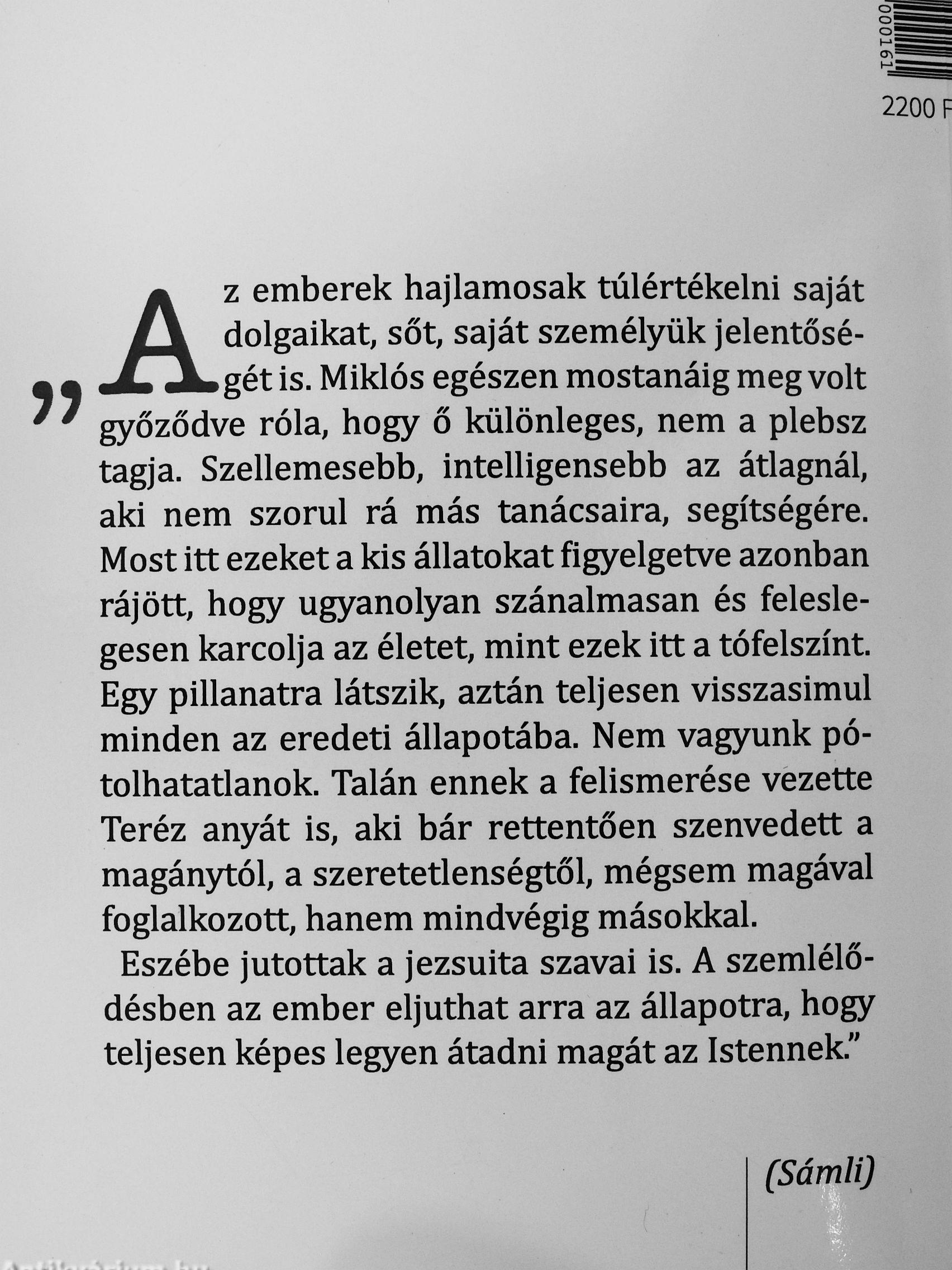 AZ emberek hajlamosak túlértékelni saját dolgaikat, sőt, saját személyük jelentőségét is. Miklós egészen mostanáig megvolt győződve róla, hogy ő különleges, nem a plebsz tagja. Szellemesebb, intelligensebb az átlagnál, aki nem szorul rá más tanácsaira, segítségére. Most itt ezeket a kis állatokat figyelgetve azonban rájött, hogy ugyanolyan szánalmasan és feleslegesen karcolja az életet, mint ezek itt a tófelszínt. Egy pillanatra látszik, aztán teljesen visszasimul minden az eredeti állapotába. Nem vagyunk pótolhatatlanok. Talán ennek a felismerése vezette Teréz anyát is, aki bár rettentően szenvedett a magánytól, a szeretetlenségtől, mégsem magával foglalkozott, hanem mindvégig másokkal.