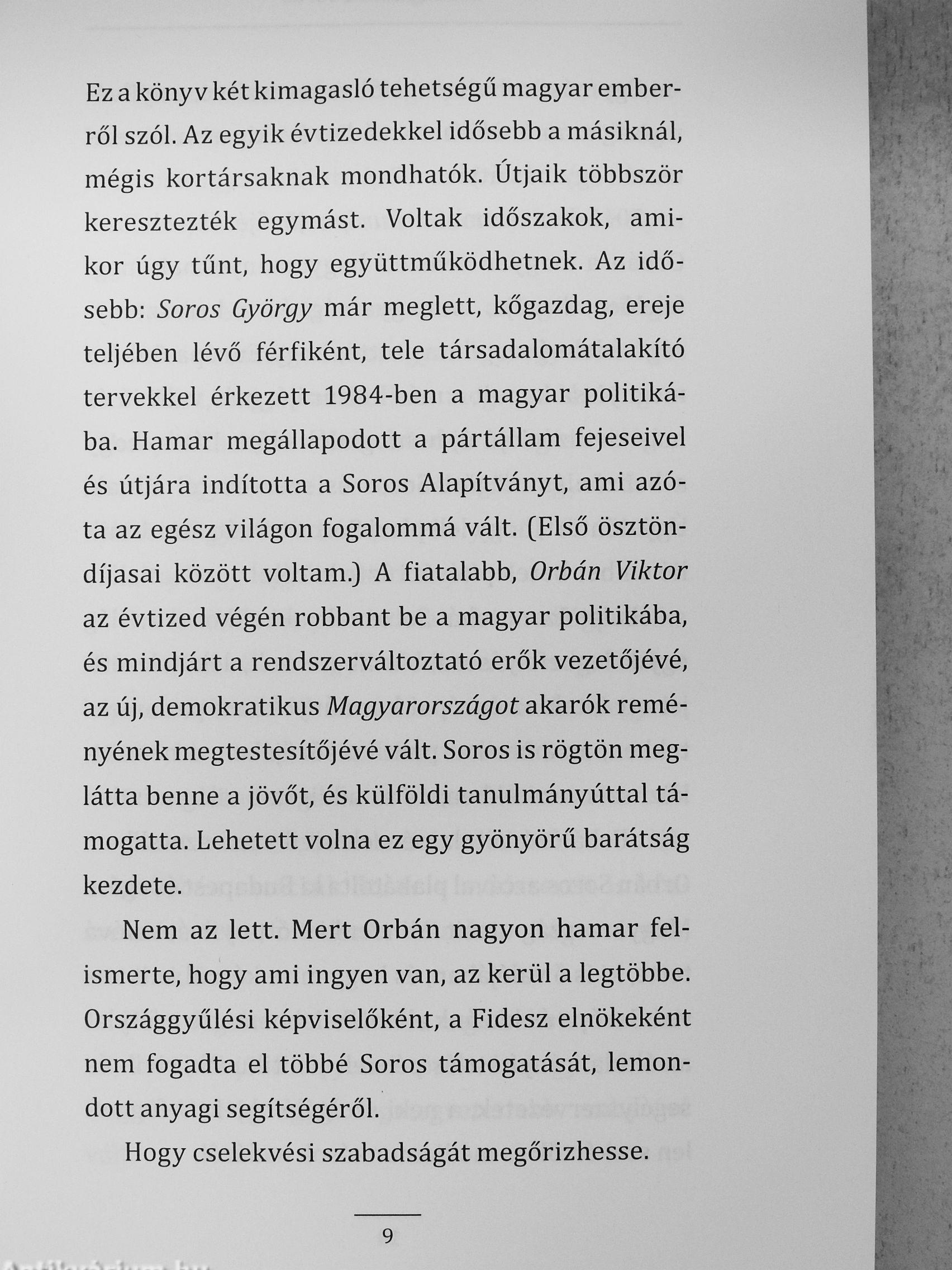 Ez a könyv két kimagasló tehetségű magyar emberről szól. Az egyik évtizedekkel idősebb a másiknál, mégis kortársaknak mondhatók. Útjaik többször keresztezték egymást. Voltak időszakok, amikor úgy tűnt, hogy együttműködhetnek. Az idősebb: Soros György már meglett, kőgazdag, ereje teljében lévő férfiként, tele társadalomátalakító tervekkel érkezett 1984-ben a magyar politikába. Hamar megállapodott a pártállam fejeseivel és útjára indította a Soros Alapítványt, ami azóta az egész világon fogalommá vált. A fiatalabb, Orbán Viktor az évtized végén robbant be a magyar politikába, és mindjárt a rendszerváltoztató erők vezetőjévé, az új, demokratikus Magyarországot akarók reményének megtestesítőjévé vált. Soros is rögtön meglátta benne a jövőt, és külföldi tanulmányúttal támogatta. Lehetett volna ez egy gyönyörű barátság kezdete. Nem az lett.