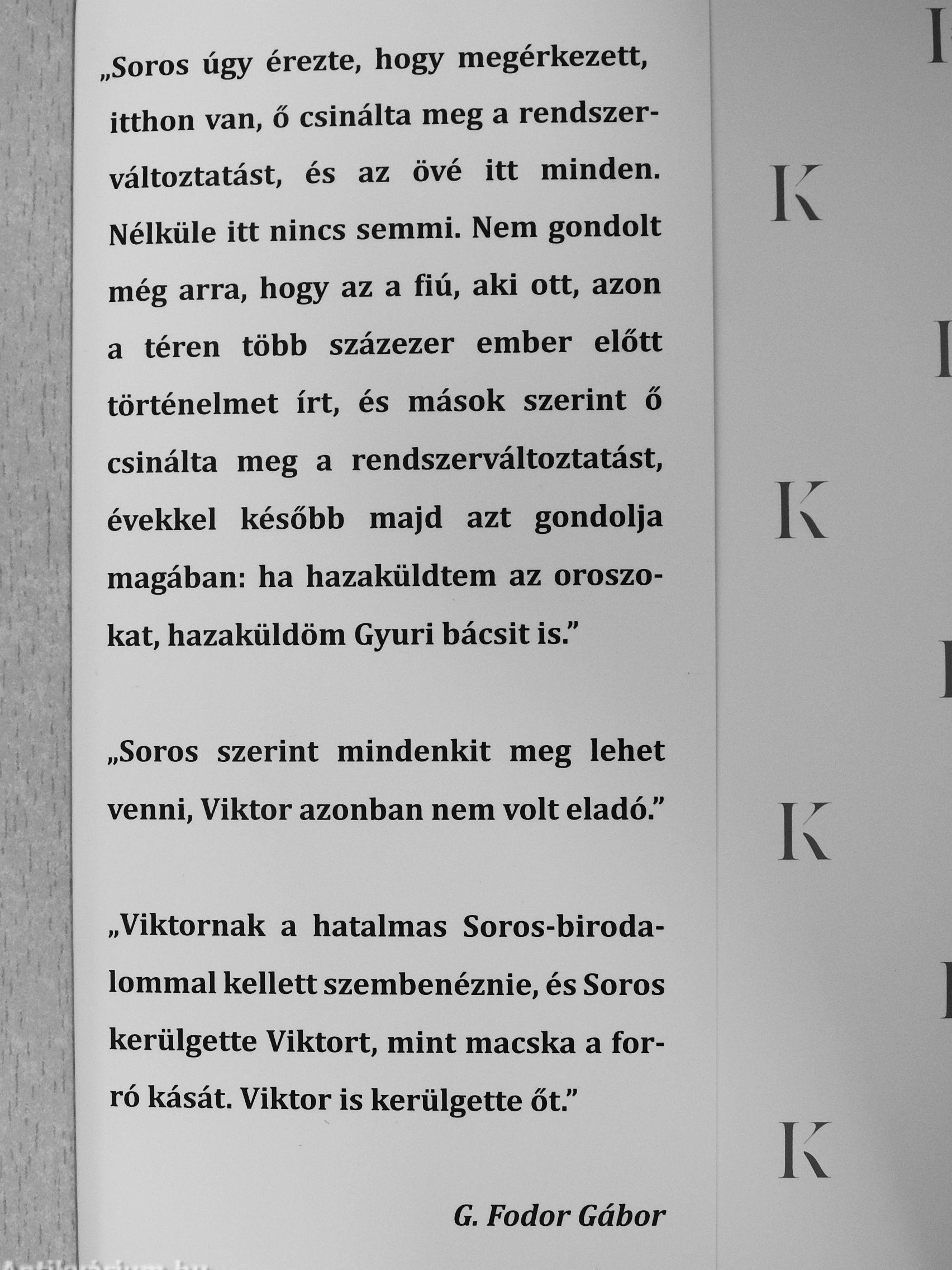 „Soros úgy érezte, hogy megérkezett, itthon van, ő csinálta meg a rendszerváltoztatást, és az övé itt minden. Nélküle itt nincs semmi. Nem gondolt még arra, hogy az a fiú, aki ott, azon a téren több százezer ember előtt történelmet írt, és mások szerint ő csinálta meg a rendszerváltoztatást, évekkel később majd azt gondolja Jy